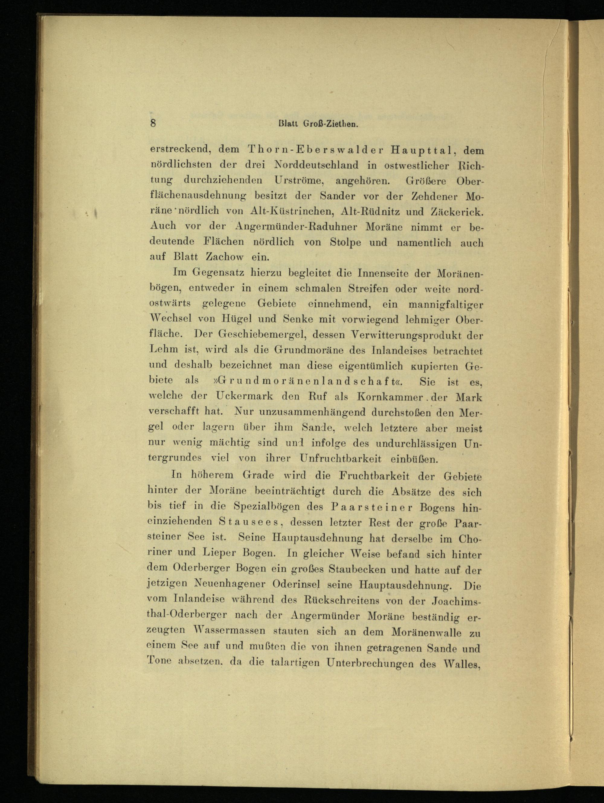erstreckend, dem Thorn-Eberswalder Haupttal, dem nördlichsten der drei Norddeutschland in ostwestlicher Richtling durchziehenden Urströme, angehören. Größere Oberflächenausdehnung besitzt der Sander vor der Zehdener Moräne nördlich von Alt-Küstrinchen, Alt-Rüdnitz und Zäckerick . Auch vor der Angermünder-Raduhner Moräne nimmt er bedeutende Flächen nördlich von Stolpe und namentlich auch auf Blatt Zachow ein.
