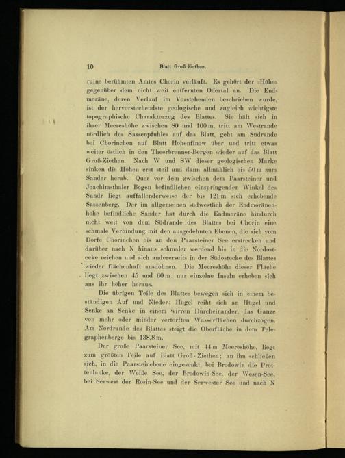 ruine berühmten Amtes Chorin verläuft. Es gehört der »Höhe« gegenüber dem nicht weit entfernten Odertal an. Die Endmoräne, deren Verlauf im Vorstehenden beschrieben wurde, ist der hervorstechendste geologische und zugleich wichtigste topographische Charakterzug des Blattes. Sie hält sich in ihrer Meereshöhe zwischen 80 und 100 m, tritt am Westrande nördlich des Sassenpfuhles auf das Blatt, geht am Südrande bei Chorinchen auf Blatt Hohenfinow über und tritt etwas weiter östlich in den Theerbrenner-Bergen wieder auf das Blatt Groß-Ziethen. Nach W und SW dieser geologischen Marke sinken die Höhen erst steil und dann allmählich bis 50 m zum Sander herab. Quer vor dem zwischen dem Paarsteiner und Joachimsthaler Bogen befindlichen einspringenden Winkel des Sandr liegt auffallenderweise der bis 121 m sich erhebende Sassenberg . Der im allgemeinen südwestlich der Endmoränenhöhe befindliche Sander hat durch die Endmoräne hindurch nicht weit von dem Südrande des Blattes bei Chorin eine schmale Verbindung mit den ausgedehnten Ebenen, die sich vom Dorfe Chorinchen bis an den Paarsteiner See erstrecken und darüber nach N hinaus schmaler werdend bis in die Nordostecke reichen und sich andererseits in der Südostceke des Blattes wieder flächenhaft ausdehnen. Die Meereshöhe dieser Fläche liegt zwischen 45 und 60 m: nur einzelne Inseln erheben sich aus ihr höher heraus.