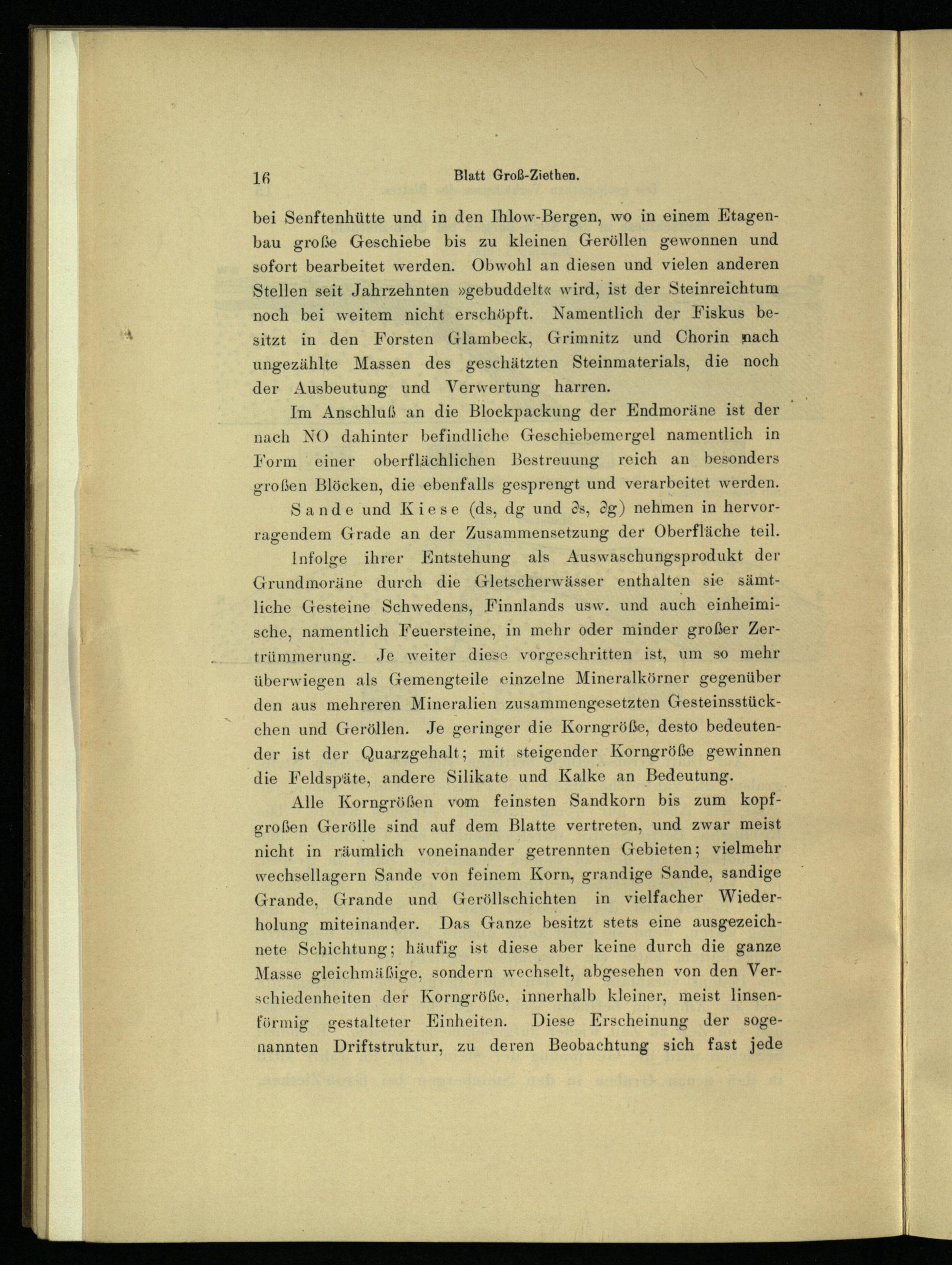 Alle Korngrößen vom feinsten Sandkorn bis zum kopfgroßen Gerölle sind auf dem Blatte vertreten, und zwar meist nicht in räumlich voneinander getrennten Gebieten; vielmehr wechsellagern Sande von feinem Korn, grandige Sande, sandige Grande, Grande und Geröllschichten in vielfacher Wiederholung miteinander. Das Ganze besitzt stets eine ausgezeichnete Schichtung; häufig ist diese aber keine durch die ganze Masse gleichmäßige, sondern wechselt, abgesehen von den Verschiedenheiten der Korngröße, innerhalb kleiner, meist linsenförmig gestalteter Einheiten. Diese Erscheinung der sogenannten Driftstruktur, zu deren Beobachtung sich fast jede
