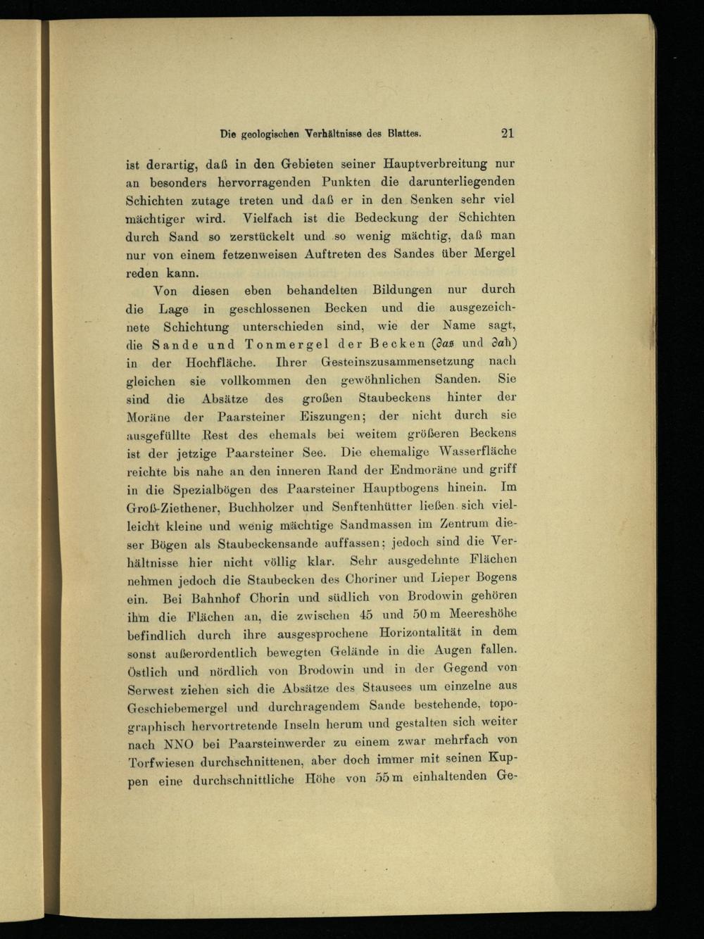 Von diesen eben behandelten Bildungen nur durch die Lage in geschlossenen Becken und die ausgezeichnete Schichtung unterschieden sind, wie der Name sagt, die Sande und Tonmergel der Becken (das und 3ah) in der Hochfläche. Ihrer Gesteinszusammensetzung nach gleichen sie vollkommen den gewöhnlichen Sanden. Sie sind die Absätze des großen Staubeckens hinter der Moräne der Paarsteiner Eiszungen; der nicht durch sie ausgefüllte liest des ehemals bei weitem größeren Beckens ist der jetzige Paarsteiner See. Die ehemalige Wasserfläche reichte bis nahe an den inneren Hand der Endmoräne und griff in die Spezialbögen des Paarsteiner Hauptbogens hinein. Im Groß-Ziethener, Buchholzer und Senftenhütter ließen, sich vielleicht kleine und wenig mächtige Sandmassen im Zentrum dieser Bögen als Staubeckensande auffassen: jedoch sind die Verhältnisse hier nicht völlig klar. Sehr ausgedehnte Flächen nehmen jedoch die Staubecken des Choriner und Lieper Bogens ein. Bei Bahnhof Chorin und südlich von Brodowin gehören ihm die Flächen an, die zwischen 45 und 50 in Meereshöhe befindlich durch ihre ausgesprochene Horizontalität in dem sonst außerordentlich bewegten Gelände in die Augen fallen. Östlich und nördlich von Brodowin und in der Gegend von Serwest ziehen sich die Absätze des Stausees um einzelne aus Geschiebemergel und durchragendem Sande bestehende, topographisch hervortretende Inseln herum und gestalten sich weiter nach NNO bei Paarsteinwerder zu einem zwar mehrfach von Torfwiesen durchschnittenen, aber doch immer mit seinen Kuppen eine durchschnittliche Höhe von 55 m einhaltenden Ge-