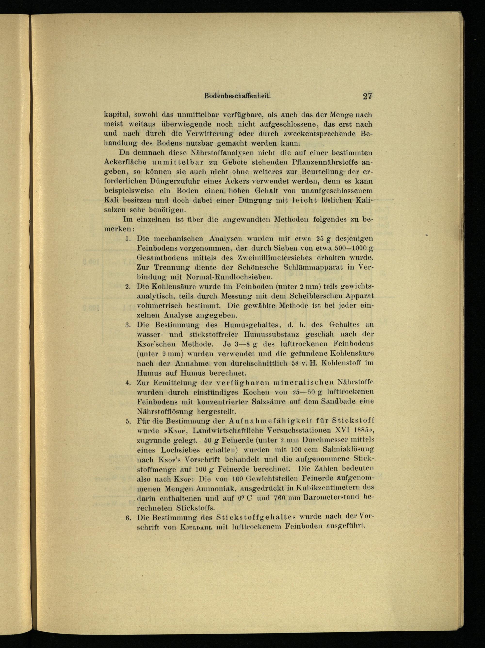 5. Für die Bestimmung der Aufnahmefähigkeit für Stickstoff wurde »Knop, Landwirtschaftliche Versuchsstationen XVI 1885«, zugrunde gelegt. 50 g Feinerde (unter 2 mm Durchmesser mittels eines Lochsiebes erhalten) wurden mit 100 ccm Salmiaklösung nach Knop’s Vorschrift behandelt und die aufgenonnnene Stickstoffmenge auf 100 g Feinerde berechnet. Die Zahlen bedeuten also nach Knop: Die von 100 Gewichtsteilen Feinerde aufgenom- menen Mengen Ammoniak, ausgedrückt in Kubikzentimetern des darin enthaltenen und auf 0° C und 760 mm Barometerstand berechneten Stickstoffs.