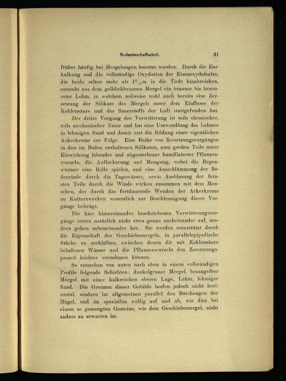 Der dritte Vorgang der Verwitterung ist teils chemischer, teils mechanischer Natur und hat eine Umwandlung des Lehmes in lehmigen Sand und damit erst die Bildung einer eigentlichen Ackerkrume zur Folge. Eine Reihe von Zersetzungsvorgängen in den im Boden enthaltenen Silikaten, zum großen Teile unter Einwirkung lebender und abgestorbener humifizierter Pflanzen- wurzeln, die Auflockerung und Mengung, wobei die Regen- würmer eine Rolle spielen, und eine Ausschlämmung der Bodenrinde durch die Tagewässer, sowie Ausblasung der feinsten Teile durch die Winde wirken zusammen mit dem Menschen, der durch das fortdauernde Wenden der Ackerkrume zu Kulturzwecken wesentlich zur Beschleunigung dieser Vorgänge beiträgt.