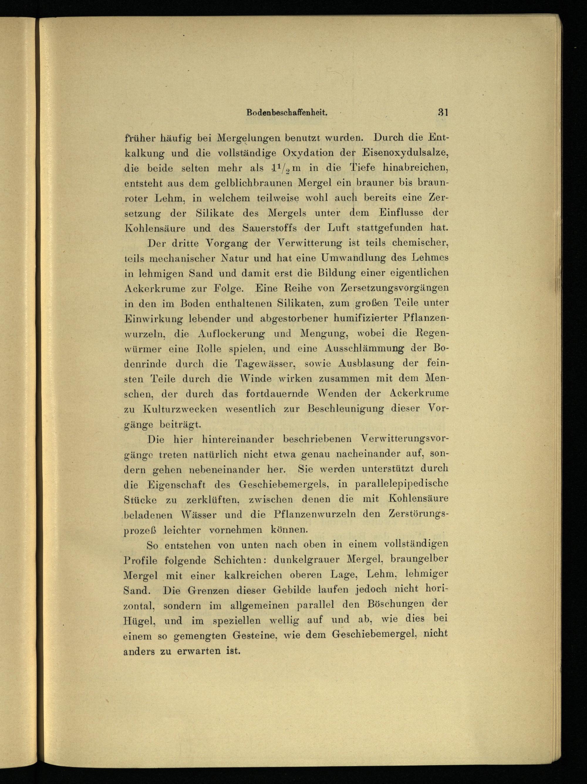 früher häufig bei Mergelungen benutzt wurden. Durch die Entkalkung und die vollständige Oxydation der Eisenoxydulsalze, die beide selten mehr als l 1 / 2 in in die Tiefe hinabreichen, entsteht aus dem gelblichbraunen Mergel ein brauner bis braunroter Lehm, in welchem teilweise wohl auch bereits eine Zersetzung der Silikate des Mergels unter dem Einflüsse der Kohlensäure und des Sauerstoffs der Luft stattgefunden hat.