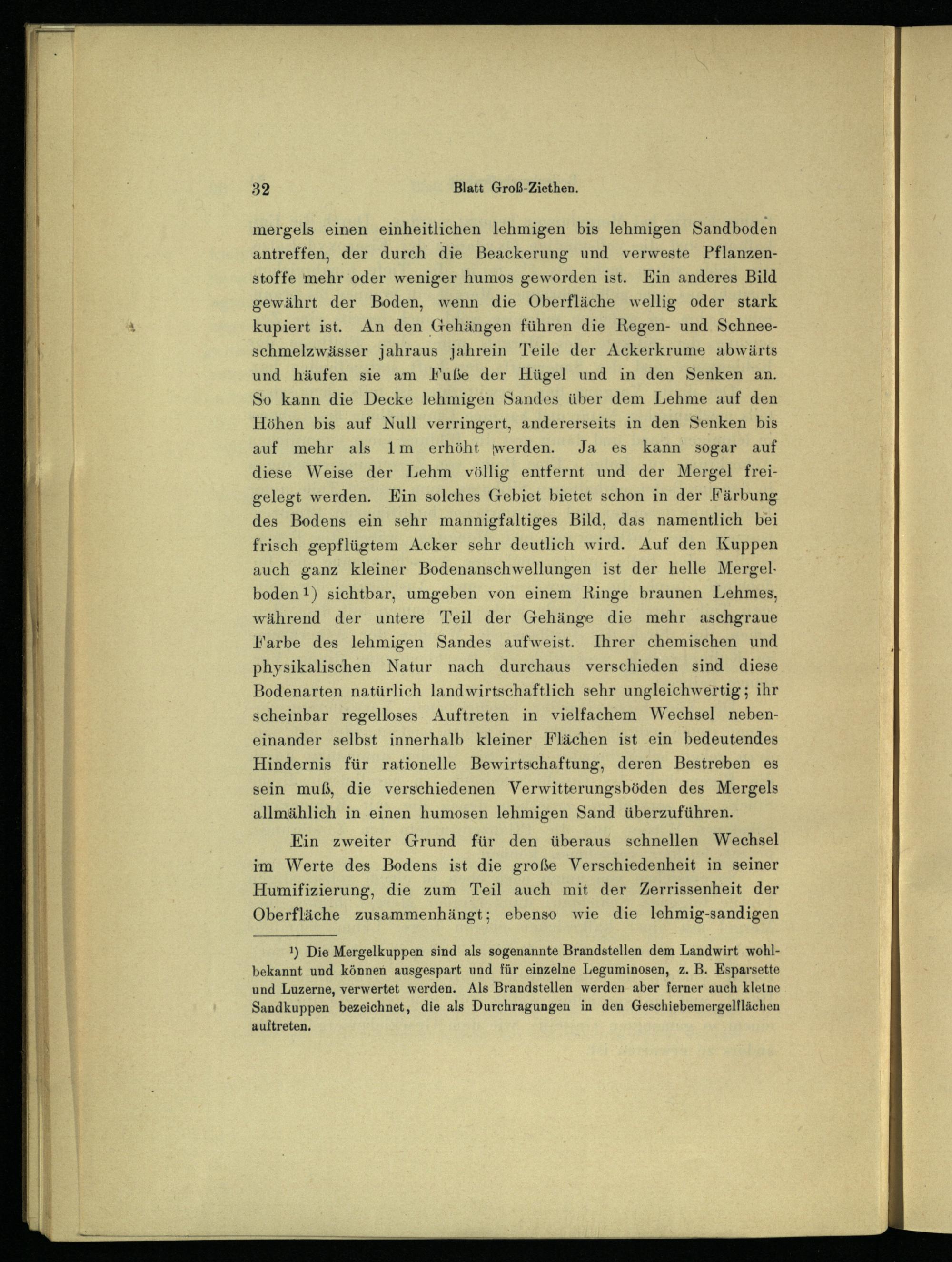 mergels einen einheitlichen lehmigen bis lehmigen Sandboden antreffen, der durch die Beackerung und verweste Pflanzen- stoffe mehr oder weniger humos geworden ist. Ein anderes Bild gewährt der Boden, wenn die Oberfläche wellig oder stark kupiert ist. An den Gehängen führen die Regen- und Schneeschmelzwässer jahraus jahrein Teile der Ackerkrume abwärts und häufen sie am Fuße der Hügel und in den Senken an. So kann die Decke lehmigen Sandes über dem Lehme auf den Höhen bis auf Null verringert, andererseits in den Senken bis auf mehr als 1 m erhöht (werden. Ja es kann sogar auf diese Weise der Lehm völlig entfernt und der Mergel freigelegt werden. Ein solches Gebiet bietet schon in der Färbung des Bodens ein sehr mannigfaltiges Bild, das namentlich bei frisch gepflügtem Acker sehr deutlich wird. Auf den Kuppen auch ganz kleiner Bodenanschwellungen ist der helle Mergelboden 1 ) sichtbar, umgeben von einem Ringe braunen Lehmes, während der untere Teil der Gehänge die mehr aschgraue Farbe des lehmigen Sandes aufweist. Ihrer chemischen und physikalischen Natur nach durchaus verschieden sind diese Bodenarten natürlich landwirtschaftlich sehr ungleichwertig; ihr scheinbar regelloses Auftreten in vielfachem Wechsel nebeneinander selbst innerhalb kleiner Flächen ist ein bedeutendes Hindernis für rationelle Bewirtschaftung, deren Bestreben es sein muß, die verschiedenen Verwitterungsböden des Mergels allmählich in einen humosen lehmigen Sand überzuführen.