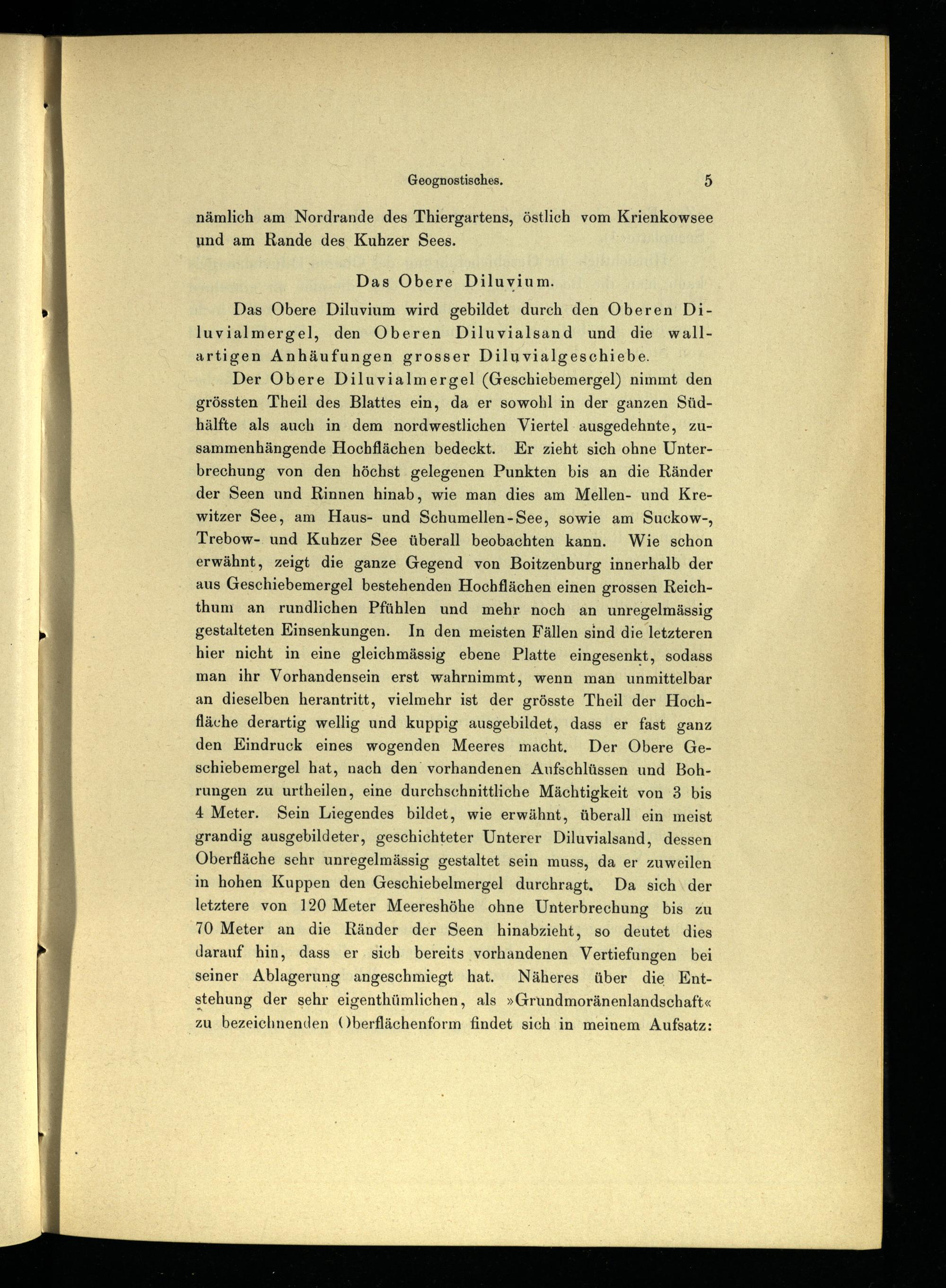 Der Obere Diluvialmergel (Geschiebemergel) nimmt den grössten Theil des Blattes ein, da er sowohl in der ganzen Südhälfte als auch in dem nordwestlichen Viertel ausgedehnte, zusammenhängende Hochflächen bedeckt. Er zieht sich ohne Unterbrechung von den höchst gelegenen Punkten bis an die Ränder der Seen und Rinnen hinab, wie man dies am Mellen- und Kre- witzer See, am Haus- und Schumellen-See, sowie am Suckow-, Trebow- und Kuhzer See überall beobachten kann. Wie schon erwähnt, zeigt die ganze Gegend von Boitzenburg innerhalb der aus Geschiebemergel bestehenden Hochflächen einen grossen Reichthum an rundlichen Pfühlen und mehr noch an unregelmässig gestalteten Einsenkungen. In den meisten Fällen sind die letzteren hier nicht in eine gleichmässig ebene Platte eingesenkt, sodass man ihr Vorhandensein erst wahrnimmt, wenn man unmittelbar an dieselben herantritt, vielmehr ist der grösste Theil der Hochfläche derartig wellig und kuppig ausgebildet, dass er fast ganz den Eindruck eines wogenden Meeres macht. Der Obere Geschiebemergel hat, nach den vorhandenen Aufschlüssen und Bohrungen zu urtheilen, eine durchschnittliche Mächtigkeit von 3 bis 4 Meter. Sein Liegendes bildet, wie erwähnt, überall ein meist grandig ausgebildeter, geschichteter Unterer Diluvialsand, dessen Oberfläche sehr unregelmässig gestaltet sein muss, da er zuweilen in hohen Kuppen den Geschiebelmergel durchragt. Da sich der letztere von 120 Meter Meereshöhe ohne Unterbrechung bis zu 70 Meter an die Ränder der Seen hinabzieht, so deutet dies darauf hin, dass er sich bereits vorhandenen Vertiefungen bei seiner Ablagerung angeschmiegt hat. Näheres über die Entstehung der sehr eigenthümlichen, als »Grundmoränenlandschaft « zu bezeichnenden Oberflächenform findet sich in meinem Aufsatz: