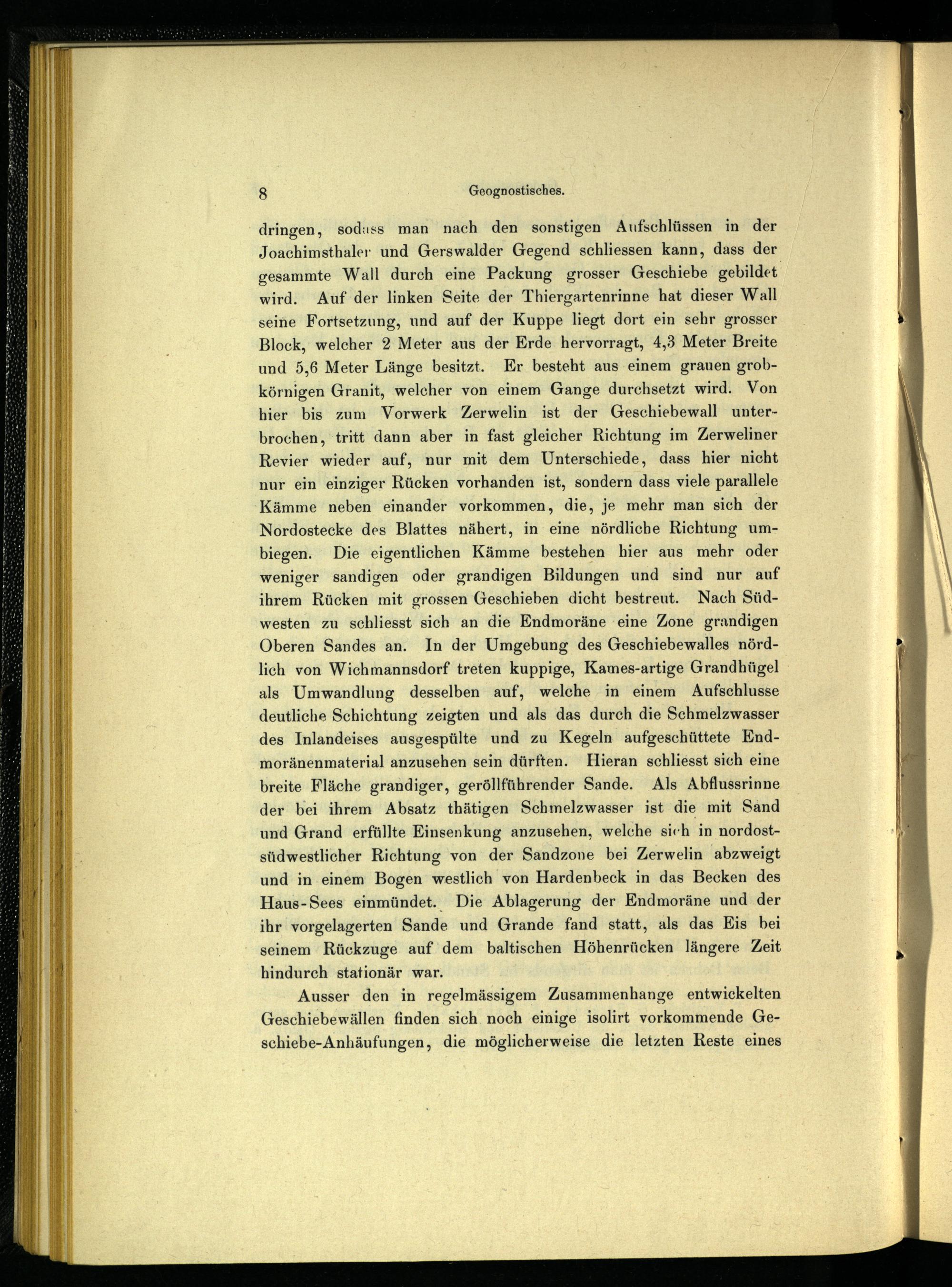 dringen, sodass man nach den sonstigen Aufschlüssen in der Joachimsthaler und Gerswalder Gegend schliessen kann, dass der gesammte Wall durch eine Packung grosser Geschiebe gebildet wird. Auf der linken Seite der Thiergartenrinne hat dieser Wall seine Fortsetzung, und auf der Kuppe liegt dort ein sehr grosser Block, welcher 2 Meter aus der Erde hervorragt, 4,3 Meter Breite und 5,6 Meter Länge besitzt. Er besteht aus einem grauen grobkörnigen Granit, welcher von einem Gange durchsetzt wird. Von hier bis zum Vorwerk Zerwelin ist der Geschiebewall unterbrochen, tritt dann aber in fast gleicher Richtung im Zerweliner Revier wieder auf, nur mit dem Unterschiede, dass hier nicht nur ein einziger Rücken vorhanden ist, sondern dass viele parallele Kämme neben einander Vorkommen, die, je mehr man sich der Nordostecke des Blattes nähert, in eine nördliche Richtung umbiegen. Die eigentlichen Kämme bestehen hier aus mehr oder weniger sandigen oder grandigen Bildungen und sind nur auf ihrem Rücken mit grossen Geschieben dicht bestreut. Nach Südwesten zu schliesst sich an die Endmoräne eine Zone grandigen Oberen Sandes an. In der Umgebung des Geschiebewalles nördlich von Wichmannsdorf treten kuppige, Kames-artige Grandhügel als Umwandlung desselben auf, welche in einem Aufschlusse deutliche Schichtung zeigten und als das durch die Schmelzwasser des Inlandeises ausgespülte und zu Kegeln aufgeschüttete Endmoränenmaterial anzusehen sein dürften. Hieran schliesst sich eine breite Fläche grandiger, geröllführender Sande. Als Abflussrinne der bei ihrem Absatz thätigen Schmelzwasser ist die mit Sand und Grand erfüllte Einsenkung anzusehen, welche sich in nordostsüdwestlicher Richtung von der Sandzone bei Zerwelin abzweigt und in einem Bogen westlich von Hardenbeck in das Becken des Haus-Sees einmündet. Die Ablagerung der Endmoräne und der ihr vorgelagerten Sande und Grande fand statt, als das Eis bei seinem Rückzuge auf dem baltischen Höhenrücken längere Zeit hindurch stationär war.