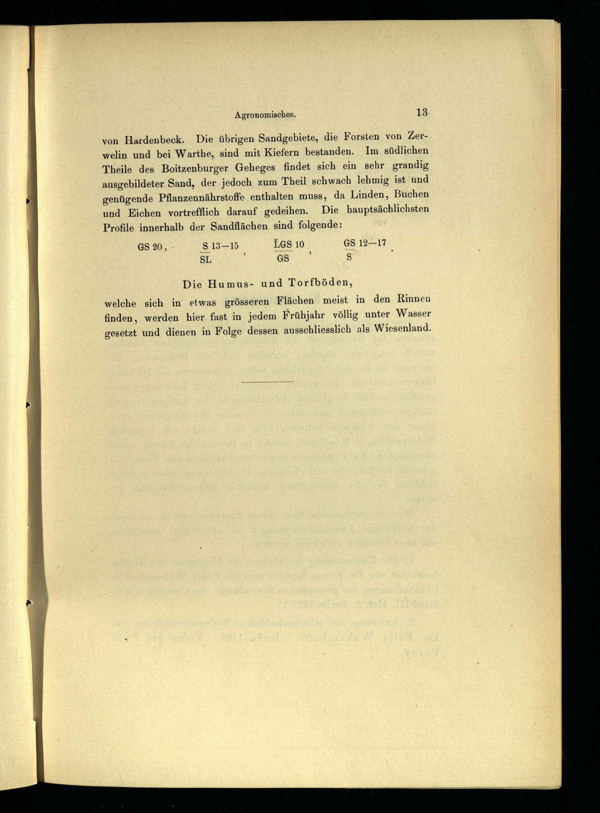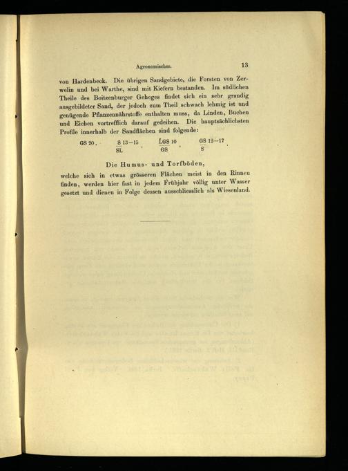 von Hardenbeck. Die übrigen Sandgebiete, die Forsten von Zer- welin und bei Warthe, sind mit Kiefern bestanden. Im südlichen Theile des Boitzenburger Geheges findet sich ein sehr grandig ausgebildeter Sand, der jedoch zum Theil schwach lehmig ist und genügende Pflanzennährstoffe enthalten muss, da Linden, Buchen und Eichen vortrefflich darauf gedeihen. Die hauptsächlichsten Profile innerhalb der Sandflächen sind folgende: