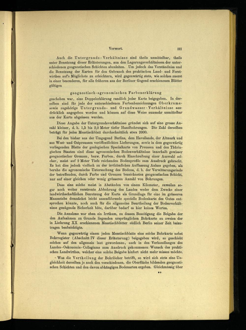 Bei den bisher aus der Umgegend Berlins , dem Havellande, der Altmark und aus West- und Ostpreussen veröffentlichten Lieferungen, sowie in dem gegenwärtig vorliegenden Blatte der geologischen Specialkarte von Preussen und den Thüringischen Staaten sind diese agronomischen Bodenverhältnisse innerhalb gewisser geognostischer Grenzen, bezw. Farben, durch Einschreibung einer Auswahl solcher, meist auf 2 Meter Tiefe reichenden Bodenprofile zum Ausdruck gebracht. Es hat dies jedoch vielfach zu der irrthümlichen Auffassung Anlass gegeben, als beruhe die agronomische Untersuchung des Bodens, d. h. der Verwitterungsrinde der betreffenden, durch Farbe und Grenzen bezeichneten geognostischen Schicht, nur auf einer gleichen oder wenig grösseren Anzahl von Bohrungen.
