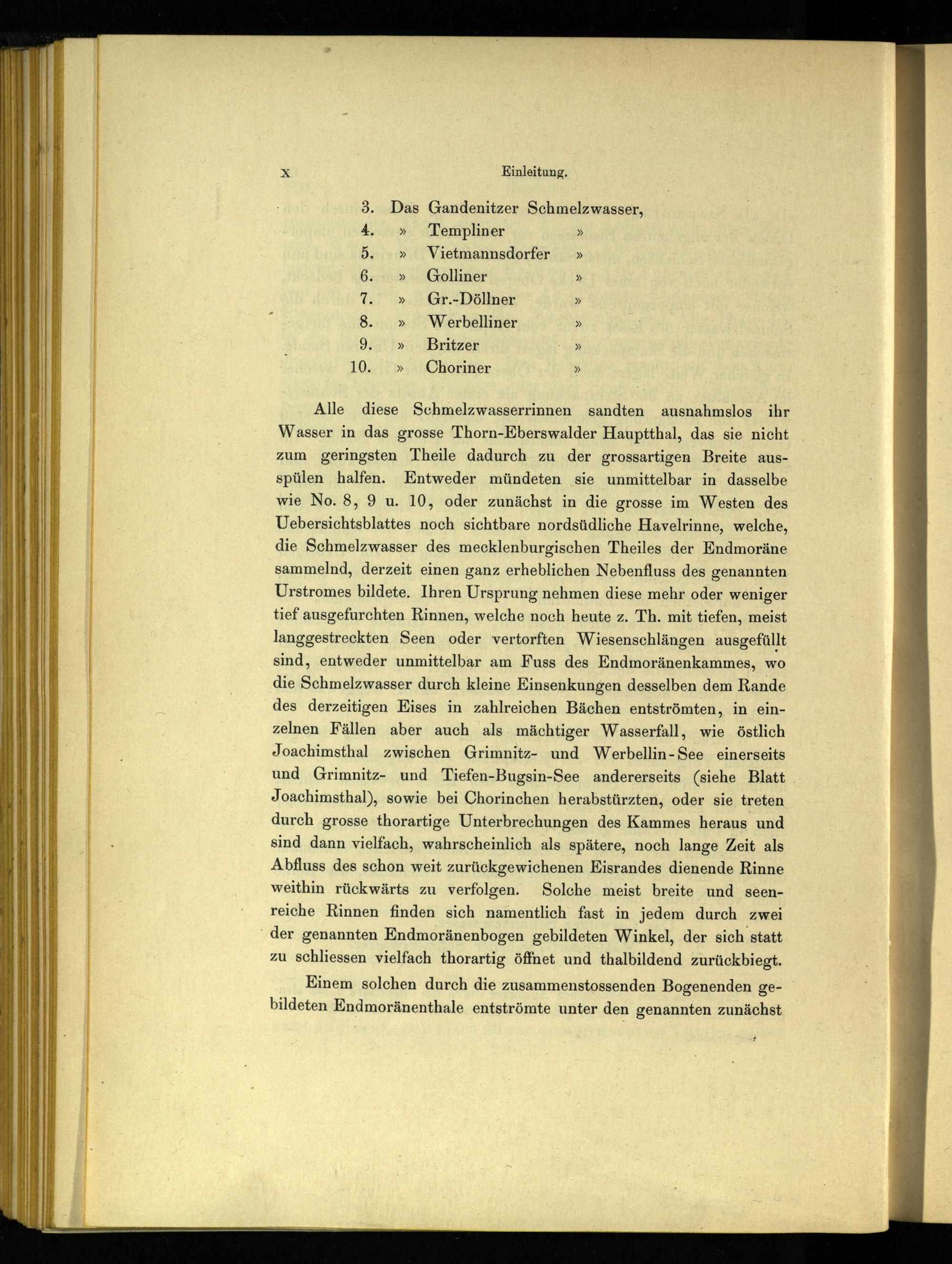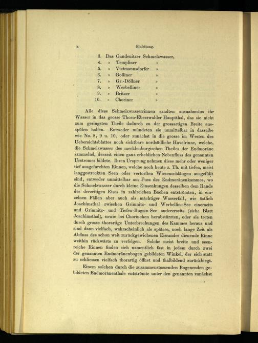 Alle diese Schmelzwasserrinnen sandten ausnahmslos ihr Wasser in das grosse Thorn-Eberswalder Hauptthal, das sie nicht zum geringsten Theile dadurch zu der grossartigen Breite aus- spülen halfen. Entweder mündeten sie unmittelbar in dasselbe wie No. 8, 9 u. 10, oder zunächst in die grosse im Westen des Uebersichtsblattes noch sichtbare nordsüdliche Havelrinne, welche, die Schmelzwasser des mecklenburgischen Theiles der Endmoräne sammelnd, derzeit einen ganz erheblichen Nebenfluss des genannten Urstromes bildete. Ihren Ursprung nehmen diese mehr oder weniger tief ausgefurchten Rinnen, welche noch heute z. Th. mit tiefen, meist langgestreckten Seen oder vertorften Wiesenschlängen ausgefüllt sind, entweder unmittelbar am Fuss des Endmoränenkammes, wo die Schmelzwasser durch kleine Einsenkungen desselben dem Rande des derzeitigen Eises in zahlreichen Bächen entströmten, in einzelnen Fällen aber auch als mächtiger Wasserfall, wie östlich Joachimsthal zwischen Grimnitz- und Werbellin-See einerseits und Grimnitz- und Tiefen-Bugsin-See andererseits (siehe Blatt Joachimsthal ), sowie bei Chorinchen herabstürzten, oder sie treten durch grosse thorartige Unterbrechungen des Kammes heraus und sind dann vielfach, wahrscheinlich als spätere, noch lange Zeit als Abfluss des schon weit zurückgewichenen Eisrandes dienende Rinne weithin rückwärts zu verfolgen. Solche meist breite und seenreiche Rinnen finden sich namentlich fast in jedem durch zwei der genannten Endmoränenbogen gebildeten Winkel, der sich statt zu schliessen vielfach thorartig öffnet und thalbildend zurückbiegt.
