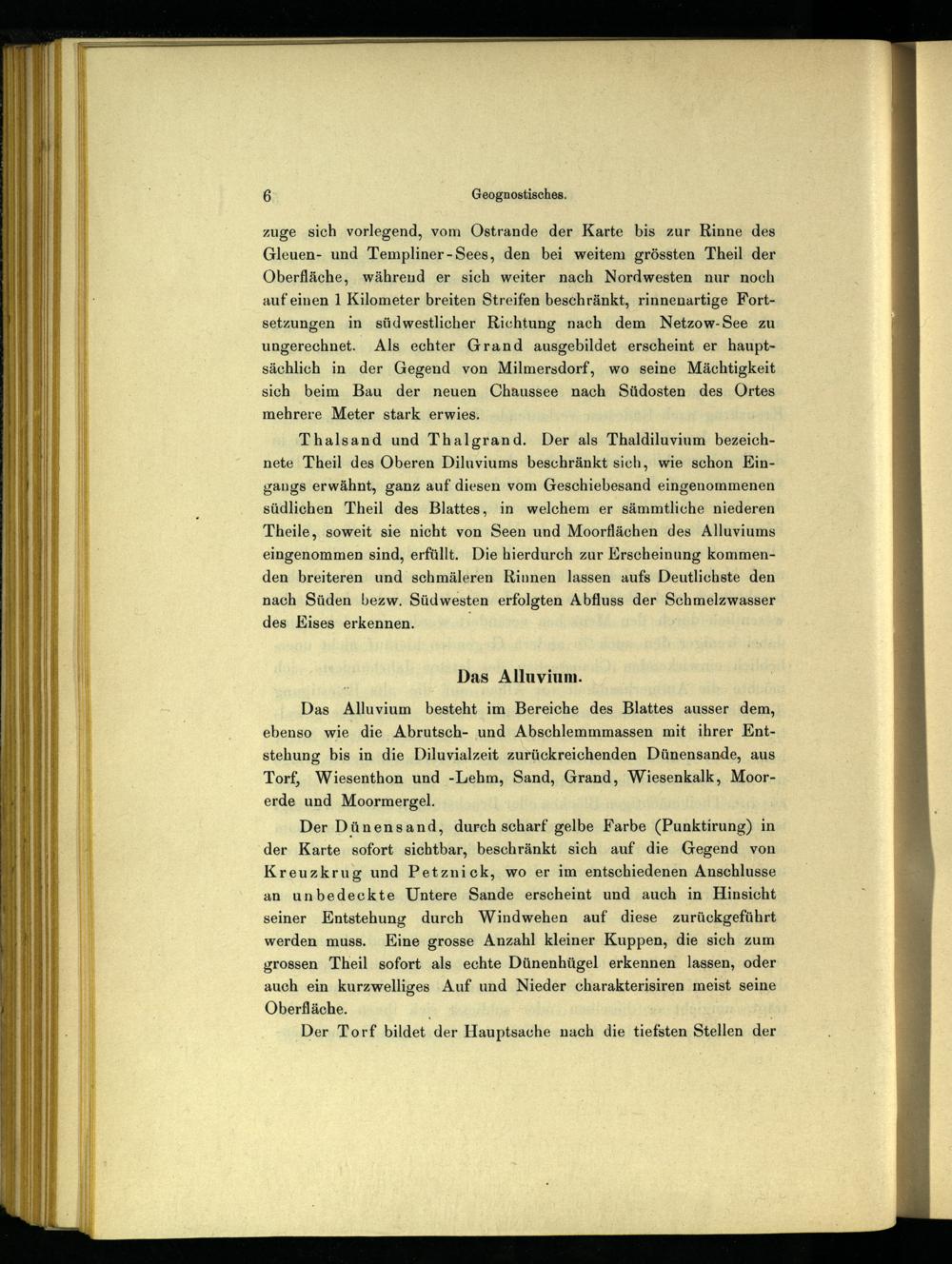 Das Alluvium besteht im Bereiche des Blattes ausser dem, ebenso wie die Abrutsch- und Abschlemmmassen mit ihrer Ent­stehung bis in die Diluvialzeit zurückreichenden Dünensande, aus Torf, Wiesenthon und -Lehm, Sand, Grand, Wiesenkalk, Moor­erde und Moormergel.