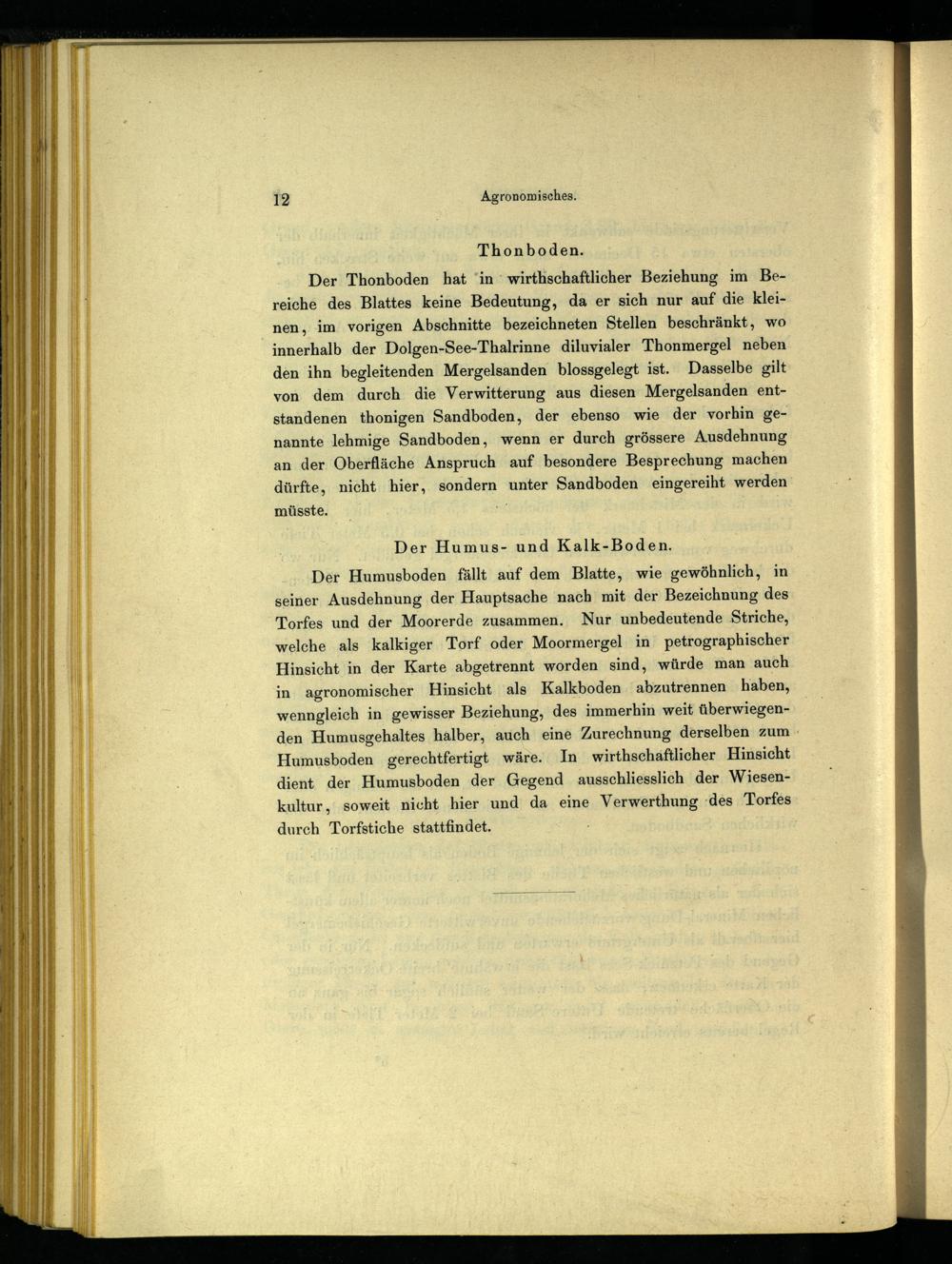 Der Humusboden fällt auf dem Blatte, wie gewöhnlich, in seiner Ausdehnung der Hauptsache nach mit der Bezeichnung des Torfes und der Moorerde zusammen. Nur unbedeutende Striche, welche als kalkiger Torf oder Moormergel in petrographischer Hinsicht in der Karte abgetrennt worden sind, würde man auch in agronomischer Hinsicht als Kalkboden abzutrennen haben, wenngleich in gewisser Beziehung, des immerhin weit überwiegenden Humusgehaltes halber, auch eine Zurechnung derselben zum Humusboden gerechtfertigt wäre. In wirthschaftlicher Hinsicht dient der Humusboden der Gegend ausschliesslich der Wiesenkultur, soweit nicht hier und da eine Verwerthung des Torfes durch Torfstiche stattfindet.