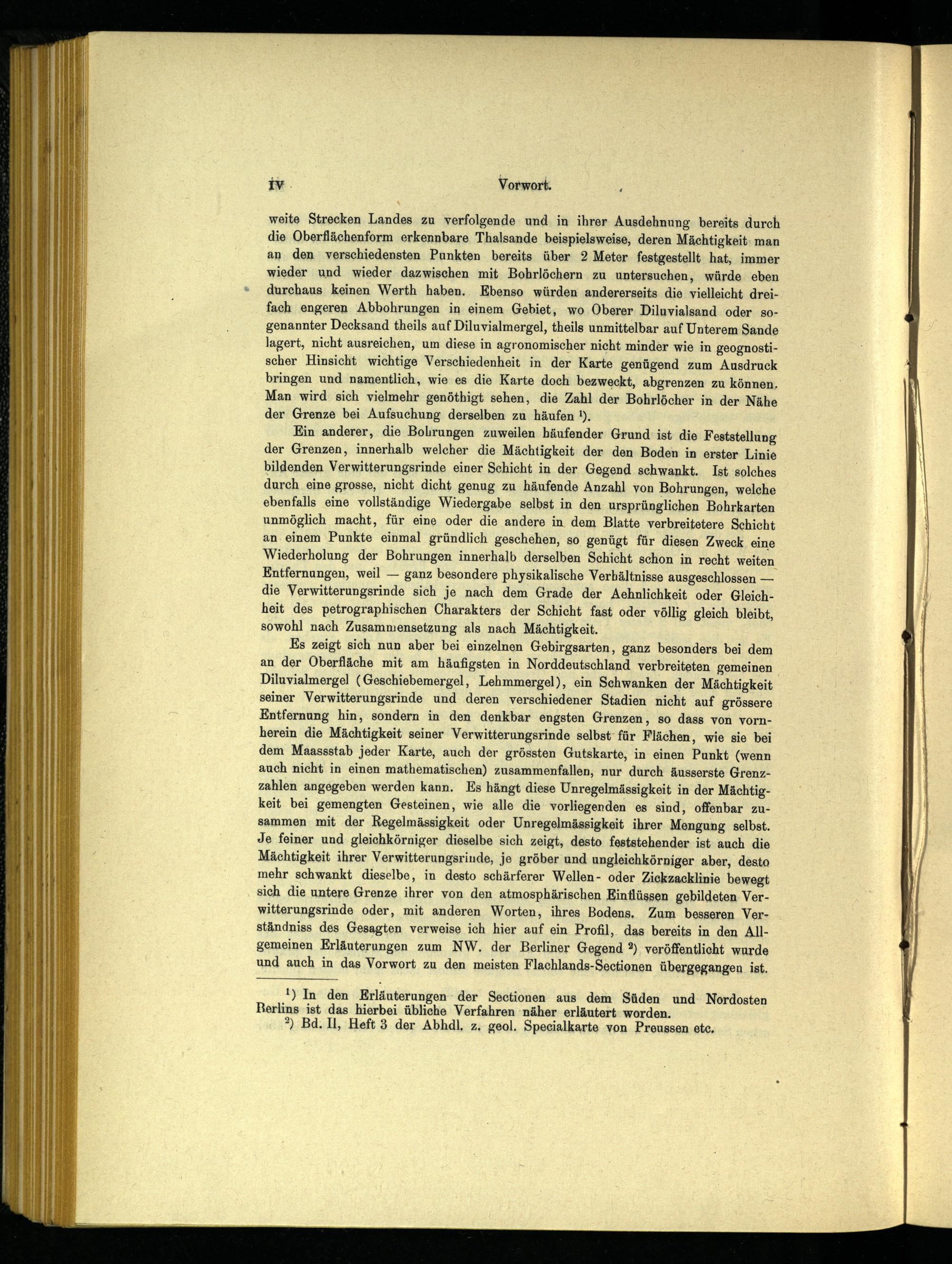 Es zeigt sich nun aber bei einzelnen Gebirgsarten, ganz besonders bei dem an der Oberfläche mit am häufigsten in Norddeutschland verbreiteten gemeinen Diluvialmergel (Geschiebemergel, Lehmmergel), ein Schwanken der Mächtigkeit seiner Verwitterungsrinde und deren verschiedener Stadien nicht auf grössere Entfernung hin, sondern in den denkbar engsten Grenzen, so dass von vornherein die Mächtigkeit seiner Verwitterungsrinde selbst für Flächen, wie sie bei dem Maassstab jeder Karte, auch der grössten Gutskarte, in einen Punkt (wenn auch nicht in einen mathematischen) zusammenfallen, nur durch äusserste Grenzzahlen angegeben werden kann. Es hängt diese Unregelmässigkeit in der Mächtigkeit bei gemengten Gesteinen, wie alle die vorliegenden es sind, offenbar zusammen mit der Regelmässigkeit oder Unregelmässigkeit ihrer Mengung selbst. Je feiner und gleichkörniger dieselbe sich zeigt, desto feststehender ist auch die Mächtigkeit ihrer Verwitterungsriude, je gröber und ungleichkörniger aber, desto mehr schwankt dieselbe, in desto schärferer Wellen- oder Zickzacklinie bewegt sich die untere Grenze ihrer von den atmosphärischen Einflüssen gebildeten Verwitterungsrinde oder, mit anderen Worten, ihres Bodens. Zum besseren Ver- ständniss des Gesagten verweise ich hier auf ein Profil, das bereits in den Allgemeinen Erläuterungen zum NW. der Berliner Gegend a ) veröffentlicht wurde und auch in das Vorwort zu den meisten Flachlands-Sectionen übergegangen ist.