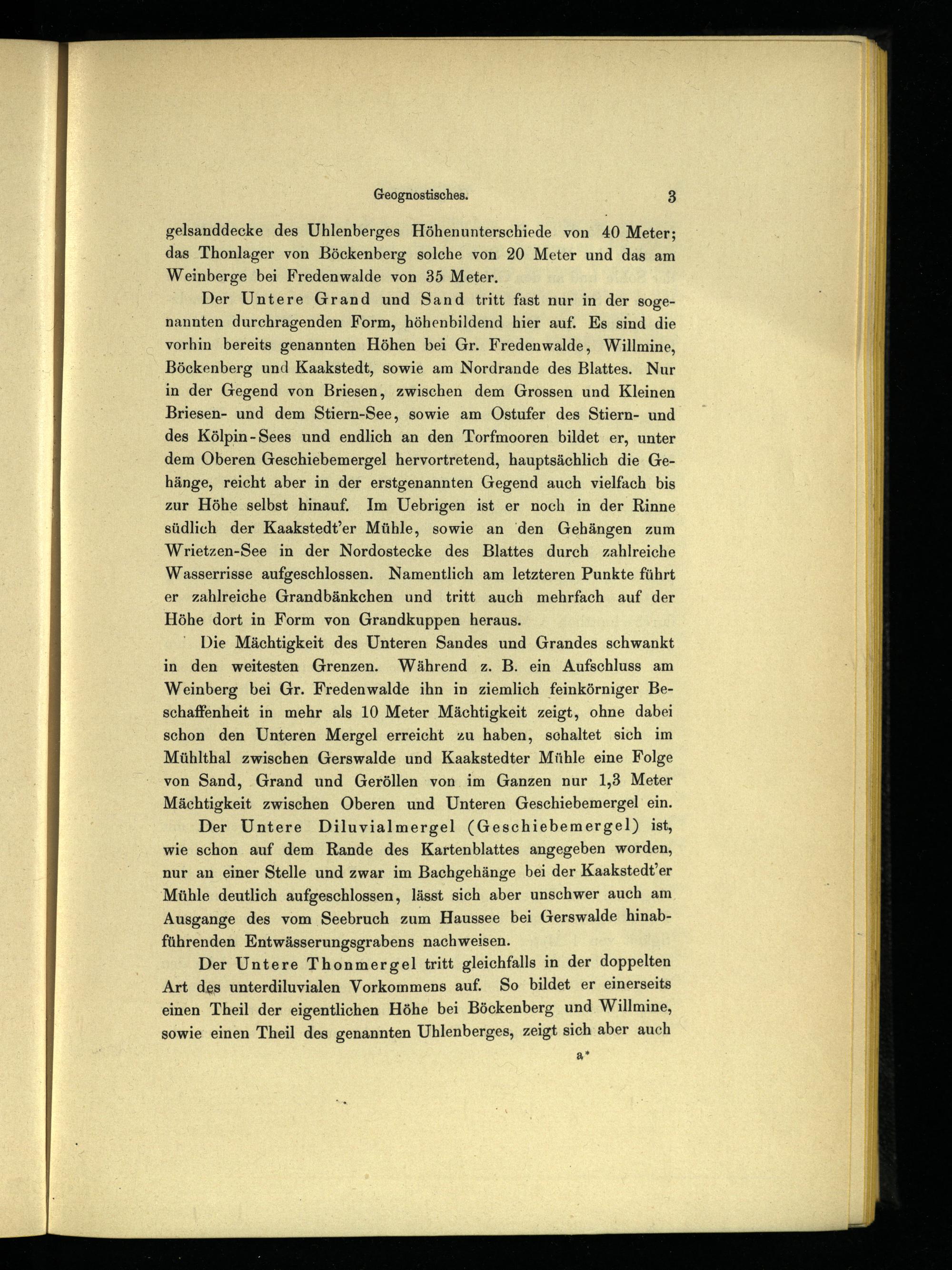 Der Untere Diluvialmergel (Geschiebemergel) ist, wie schon auf dem Rande des Kartenblattes angegeben worden, nur an einer Stelle und zwar im Bachgehänge bei der Kaakstedt’er Mühle deutlich aufgeschlossen, lässt sich aber unschwer auch am Ausgange des vom Seebruch zum Haussee bei Gerswalde hinabführenden Entwässerungsgrabens nachweisen.
