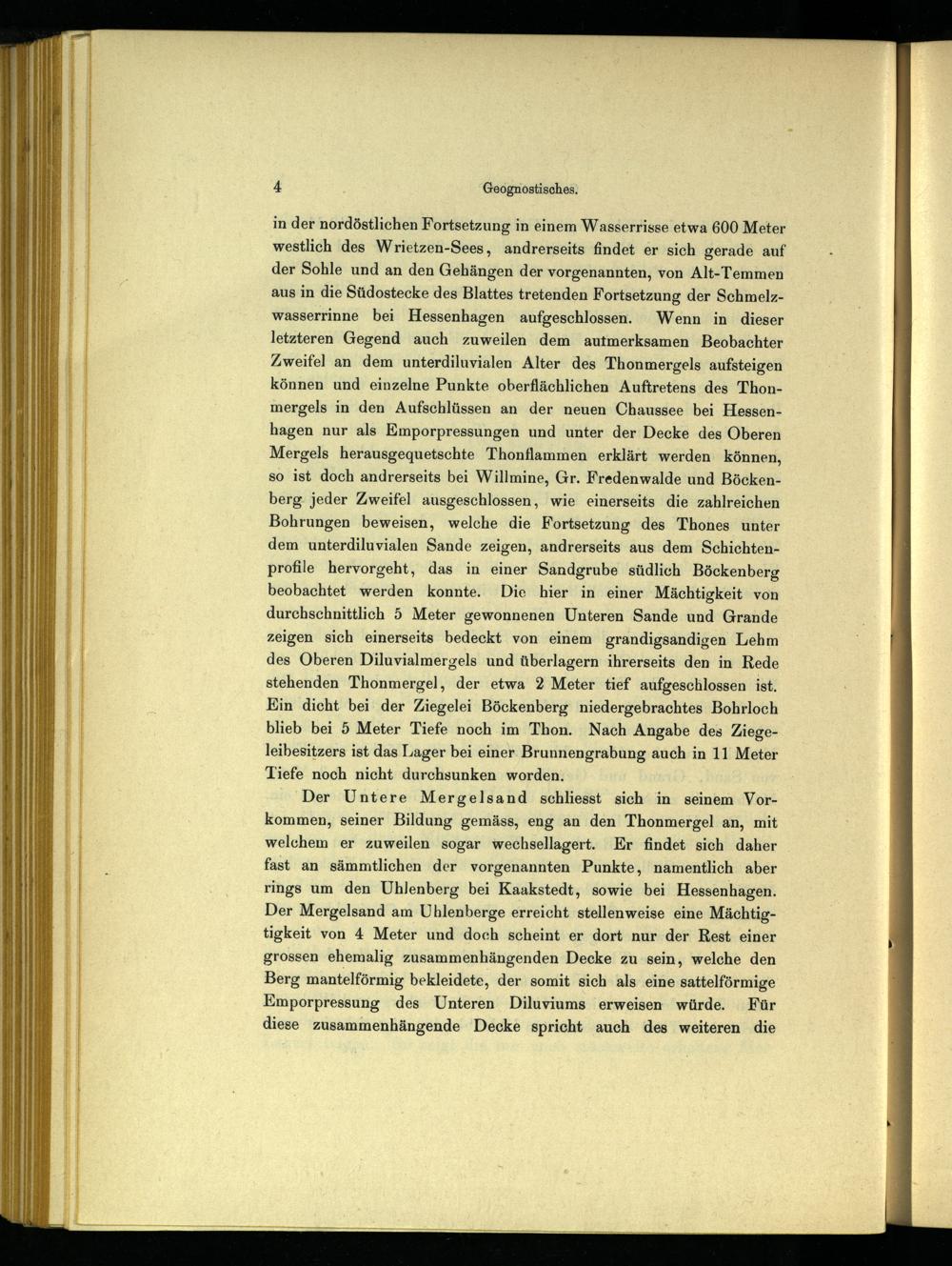 in der nordöstlichen Fortsetzung in einem Wasserrisse etwa 600 Meter westlich des Wrietzen-Sees, andrerseits findet er sich gerade auf der Sohle und an den Gehängen der vorgenannten, von Alt-Temmen aus in die Südostecke des Blattes tretenden Fortsetzung der Schmelzwasserrinne bei Hessenhagen aufgeschlossen. Wenn in dieser letzteren Gegend auch zuweilen dem aufmerksamen Beobachter Zweifel an dem unterdiluvialen Alter des Thonmergels aufsteigen können und einzelne Punkte oberflächlichen Auftretens des Thonmergels in den Aufschlüssen an der neuen Chaussee bei Hessenhagen nur als Emporpressungen und unter der Decke des Oberen Mergels herausgequetschte Thonflammen erklärt werden können, so ist doch andrerseits bei Willmine, Gr. Fredenwalde und Böcken- berg jeder Zweifel ausgeschlossen, wie einerseits die zahlreichen Bohrungen beweisen, welche die Fortsetzung des Thones unter dem unterdiluvialen Sande zeigen, andrerseits aus dem Schichtenprofile hervorgeht, das in einer Sandgrube südlich Böckenberg beobachtet werden konnte. Die hier in einer Mächtigkeit von durchschnittlich 5 Meter gewonnenen Unteren Sande und Grande zeigen sich einerseits bedeckt von einem grandigsandigen Lehm des Oberen Diluvialmergels und überlagern ihrerseits den in Rede stehenden Thonmergel, der etwa 2 Meter tief aufgeschlossen ist. Ein dicht bei der Ziegelei Böckenberg niedergebrachtes Bohrloch blieb bei 5 Meter Tiefe noch im Thon. Nach Angabe des Ziegeleibesitzers ist das Lager bei einer Brunnengrabung auch in 11 Meter Tiefe noch nicht durchsunken worden.