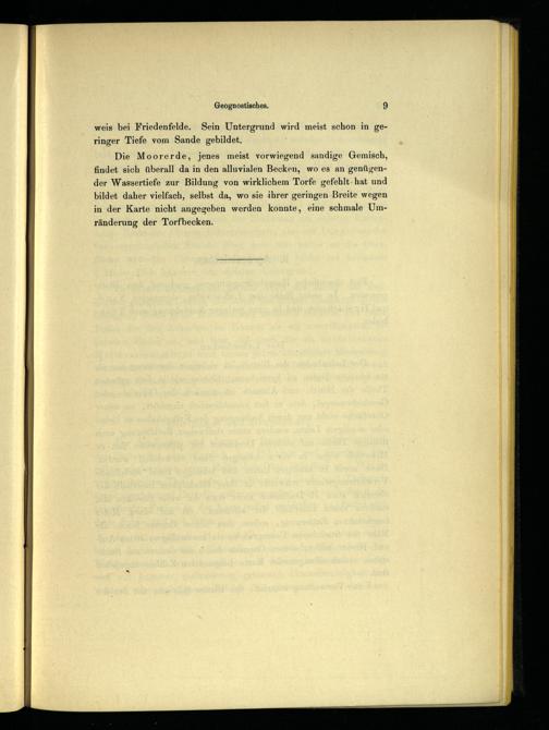 Die Moorerde, jenes meist vorwiegend sandige Gemisch, findet sich überall da in den alluvialen Becken, wo es an genügender Wassertiefe zur Bildung von wirklichem Torfe gefehlt hat und bildet daher vielfach, selbst da, wo sie ihrer geringen Breite wegen in der Karte nicht angegeben werden konnte, eine schmale Um- ränderung der Torfbecken.
