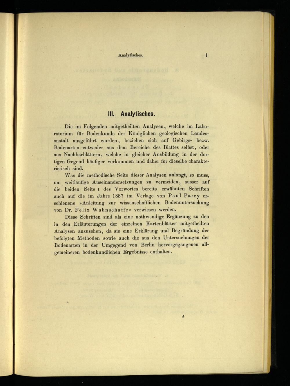 Was die methodische Seite dieser Analysen anlangt, so muss, um weitläufige Auseinandersetzungen zu vermeiden, ausser auf die beiden Seite I des Vorwortes bereits erwähnten Schriften auch auf die im Jahre 1887 im Verlage von Paul Parey erschienene »Anleitung zur wissenschaftlichen Bodenuntersuchung von Dr. Felix Wahnschaffe« verwiesen werden.