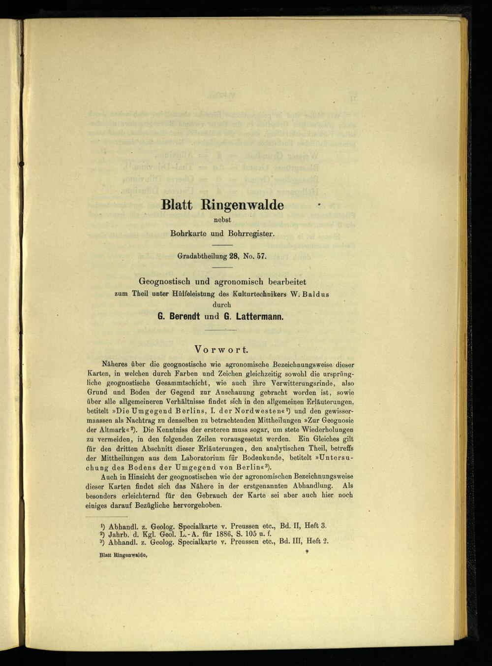 Näheres über die geognostische wie agronomische Bezeichnungsweise dieser Karten, in welchen durch Farben und Zeichen gleichzeitig sowohl die ursprüngliche geognostische Gesammtschicht, wie auch ihre Verwitterungsrinde, also Grund und Boden der Gegend zur Anschauung gebracht worden ist, sowie über alle allgemeineren Verhältnisse findet sich in den allgemeinen Erläuterungen, betitelt »Die Umgegend Berlins, I. der Nordwesten«*) und den gewisser- maassen als Nachtrag zu denselben zu betrachtenden Mittheilungen »Zur Geognosie der Altmark« 2 ). Die Kenntniss der ersteren muss sogar, um stete Wiederholungen zu vermeiden, in den folgenden Zeilen vorausgesetzt werden. Ein Gleiches gilt für den dritten Abschnitt dieser Erläuterungen, den analytischen Theil, betreffs der Mittheilungen aus dem Laboratorium für Bodenkunde, betitelt »Untersuchung des Bodens der Umgegend von Berlin« 3 ).