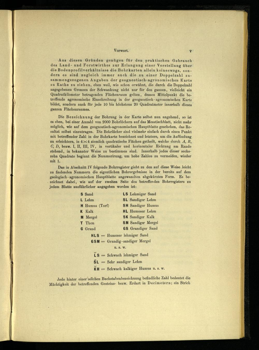Das in Abschnitt IV folgende Bohrregister giebt zu den auf diese Weise leicht zu findenden Nummern die eigentlichen Bohrergebnisse in der bereits auf dem geologisch - agronomischen Hauptblatte angewandten abgekürzten Form. Es bezeichnet dabei, wie auf der zweiten Seite des betreffenden Bohrregisters zu jedem Blatte ausführlicher angegeben worden ist: