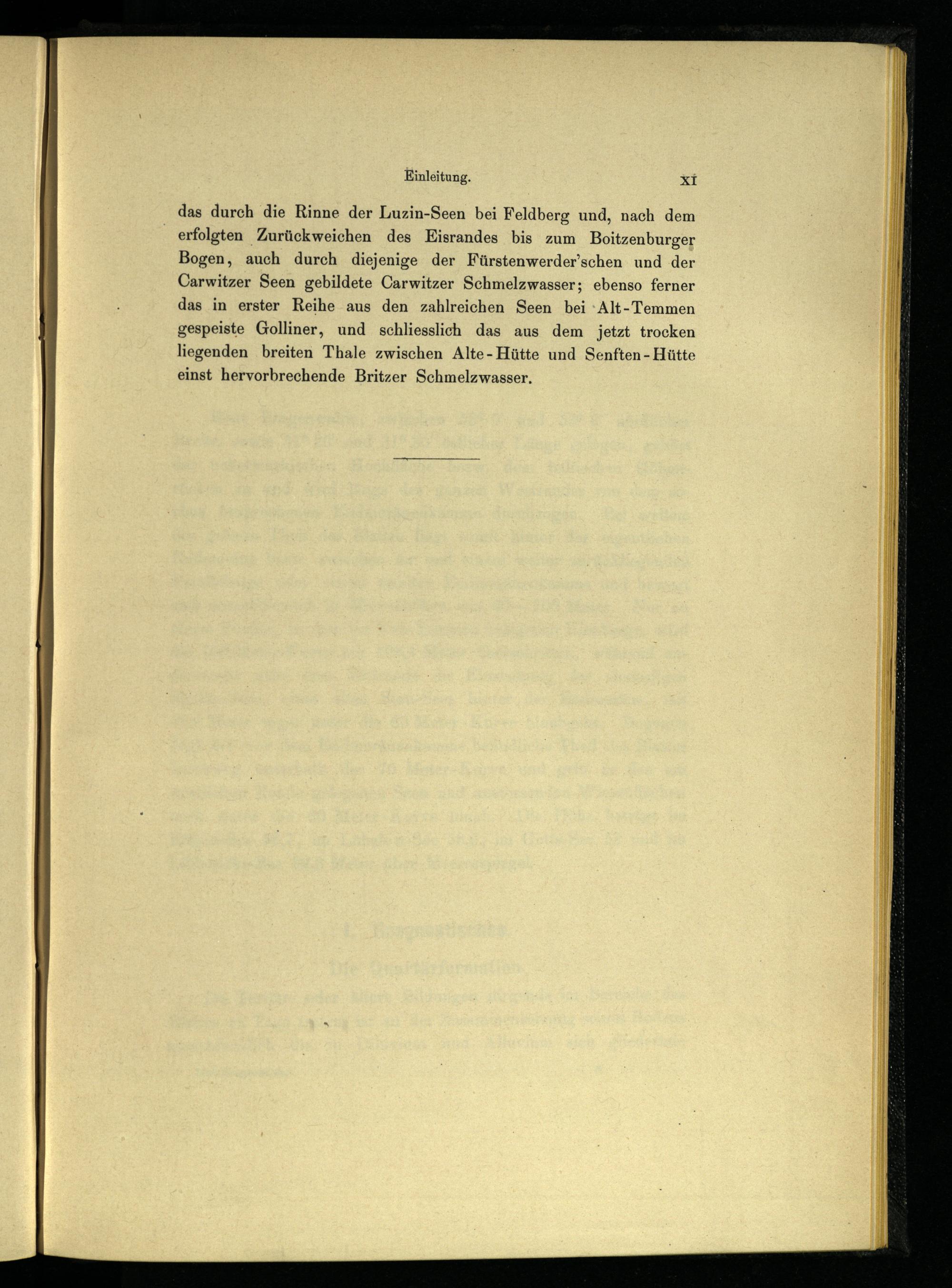 das durch die Rinne der Luzin-Seen bei Feldberg und, nach dem erfolgten Zurückweichen des Eisrandes bis zum Boitzenburger Bogen, auch durch diejenige der Fürstenwerder’schen und der Carwitzer Seen gebildete Carwitzer Schmelzwasser; ebenso ferner das in erster Reihe aus den zahlreichen Seen bei Alt-Temmen gespeiste Golliner, und schliesslich das aus dem jetzt trocken liegenden breiten Thale zwischen Alte-Hütte und Senften-Hütte einst hervorbrechende Britzer Schmelzwasser.