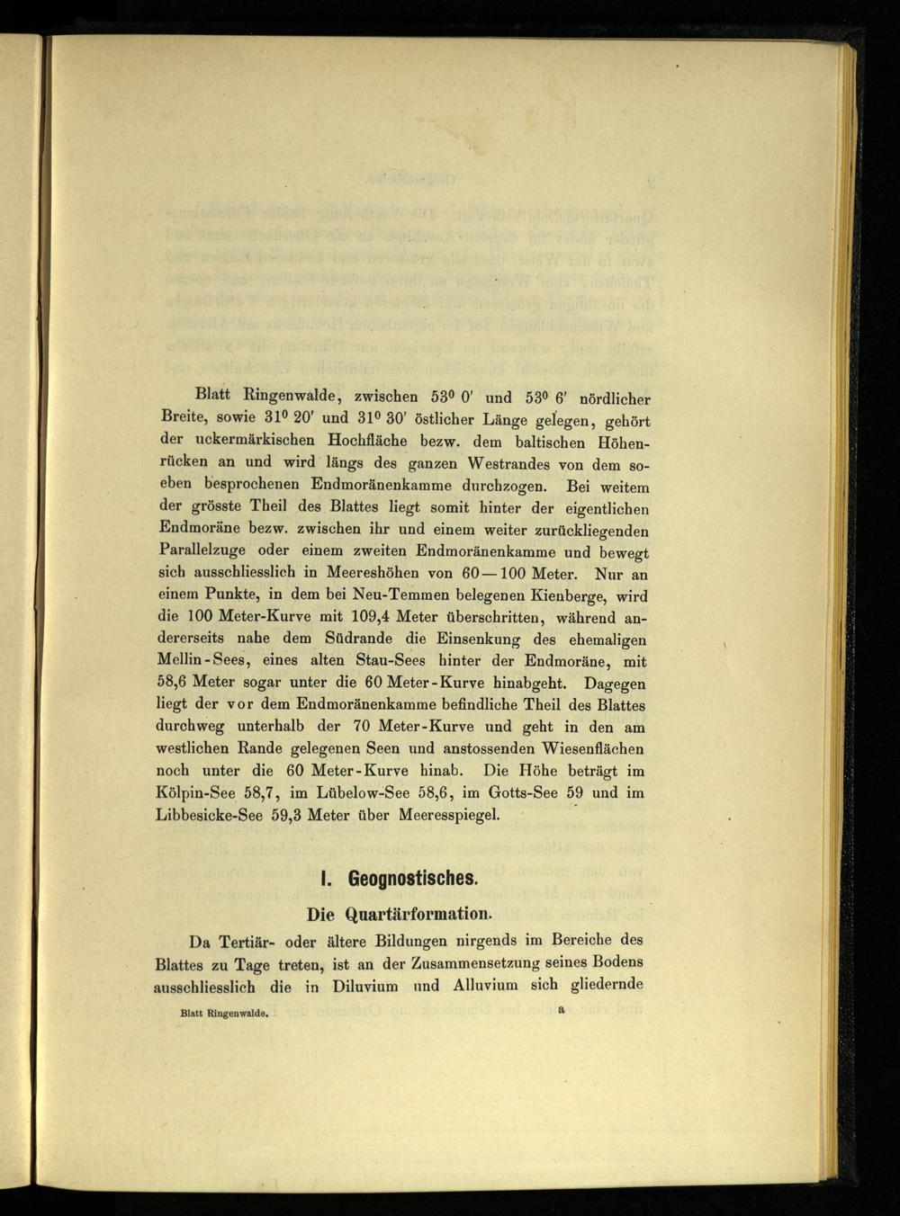 Blatt Ringenwalde , zwischen 53° 0' und 53° 6' nördlicher Breite, sowie 31° 20' und 31° 30' östlicher Länge gelegen, gehört der uckermärkischen Hochfläche bezw. dem baltischen Höhenrücken an und wird längs des ganzen Westrandes von dem soeben besprochenen Endmoränenkamme durchzogen. Bei weitem der grösste Theil des Blattes liegt somit hinter der eigentlichen Endmoräne bezw. zwischen ihr und einem weiter zurückliegenden Parallelzuge oder einem zweiten Endmoränenkamme und bewegt sich ausschliesslich in Meereshöhen von 60—100 Meter. Nur an einem Punkte, in dem bei Neu-Temmen belegenen Kienberge, wird die 100 Meter-Kurve mit 109,4 Meter überschritten, während andererseits nahe dem Südrande die Einsenkung des ehemaligen Mellin-Sees, eines alten Stau-Sees hinter der Endmoräne, mit 58,6 Meter sogar unter die 60 Meter-Kurve hinabgeht. Dagegen liegt der vor dem Endmoränenkamme befindliche Theil des Blattes durchweg unterhalb der 70 Meter-Kurve und geht in den am westlichen Rande gelegenen Seen und anstossenden Wiesenflächen noch unter die 60 Meter-Kurve hinab. Die Höhe beträgt im Kölpin-See 58,7, im Lübelow-See 58,6, im Gotts -See 59 und im Libbesicke-See 59,3 Meter über Meeresspiegel.