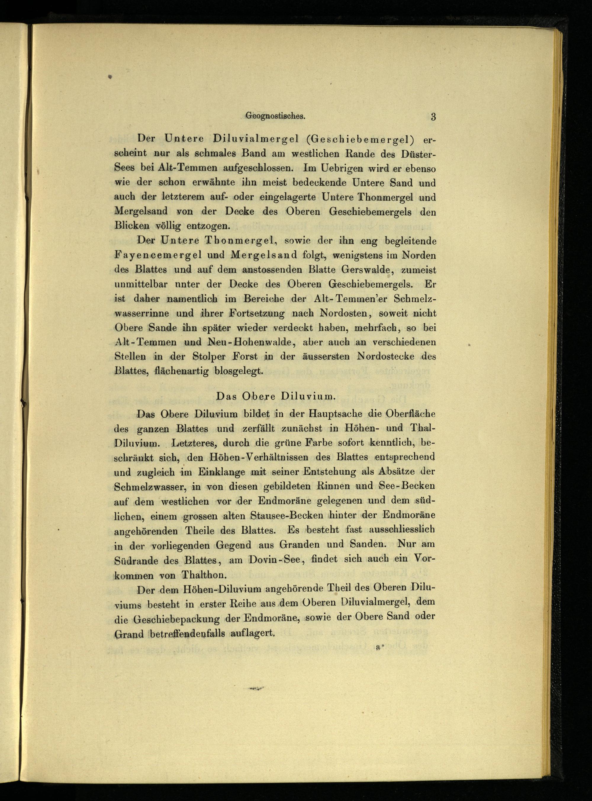 Der Untere Thonmergel, sowie der ihn eng begleitende Fayencemergel und Mergelsand folgt, wenigstens im Norden des Blattes und auf dem anstossenden Blatte Gerswalde, zumeist unmittelbar unter der Decke des Oberen Geschiebemergels. Er ist daher namentlich im Bereiche der Alt-Temmen’er Schmelzwasserrinne und ihrer Fortsetzung nach Nordosten, soweit nicht Obere Sande ihn später wieder verdeckt haben, mehrfach, so bei Alt-Temmen und Neu-Hohenwalde , aber auch an verschiedenen Stellen in der Stolper Forst in der äussersten Nordostecke des Blattes, flächenartig blosgelegt.