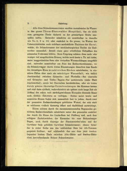 Einem solchen durch die zusammenstossenden Bogenenden gebildeten Endmoränenthale entströmte unter den genannten zunächst das durch die Rinne der Luzin-Seen bei Feldberg und, nach dem erfolgten Zurückweichen des Eisrandes bis zum Boitzenburger Bogen, auch durch diejenige der Fürstenwerder’schen und der Carwitzer Seen gebildete Carwitzer Schmelzwasser; ebenso ferner das in erster Reihe aus den zahlreichen Seen bei Alt-Temmen gespeiste Golliner, und schliesslich das aus dem jetzt trocken liegenden breiten Thale zwischen Alte-Hütte und Senften-Hütte einst hervorbrechende Britzer Schmelzwasser.