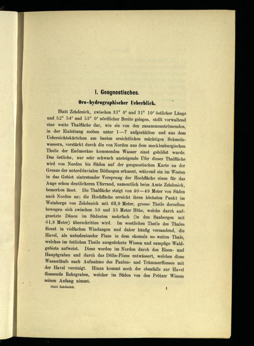 Blatt Zehdenick , zwischen 31° 0' und 31° 10' östlicher Länge und 52 n 54' und 53° 0' nördlicher Breite gelegen, stellt vorwaltend eine weite Thalfläche dar, wie sie von den zusammenströmenden, in der Einleitung soeben unter 1—7 aufgezählten und aus dem Uebersichtskärtchen am besten ersichtlichen mächtigen Schmelzwassern, verstärkt durch die von Norden aus dem mecklenburgischen Theile der Endmoräne kommenden Wasser einst gebildet wurde. Das östliche, nur sehr schwach ansteigende Ufer dieser Thalfläche wird von Norden bis Süden auf der geognostischen Karte an der Grenze der unterdiluvialen Bildungen erkannt, während ein im Westen in das Gebiet eintretender Vorsprung der Hochfläche einen für das Auge schon deutlicheren Uferrand, namentlich beim Amte Zehdenick , bemerken lässt. Die Thalfläche steigt von 40—49 Meter von Süden nach Norden an; die Hochfläche erreicht ihren höchsten Punkt im Weinberge von Zehdenick mit 63,9 Meter, grosse Theile derselben bewegen sich zwischen 50 und 55 Meter Höhe, welche durch aufgesetzte Dünen im Südosten mehrfach (in den Saubergen mit 61,8 Meter) überschritten wird. Im westlichen Theile des Thales fliesst in vielfachen Windungen und daher häufig versandend, die Havel , als unbedeutender Fluss in dem ehemals so- weiten Thale , welches im östlichen Theile ausgedehnte Wiesen und sumpfige Waldgebiete aufweist. Diese werden im Norden durch den Eisen- und Hauptgraben und durch das Dölln-Fliess entwässert, welches diese Wasserläufe nach Aufnahme des Faulen- und Trämmerfliesses mit der Havel vereinigt. Hinzu kommt noch der ebenfalls zur Havel fliessende Rohrgraben, welcher im Süden von den Prötzer Wiesen seinen Anfang nimmt.