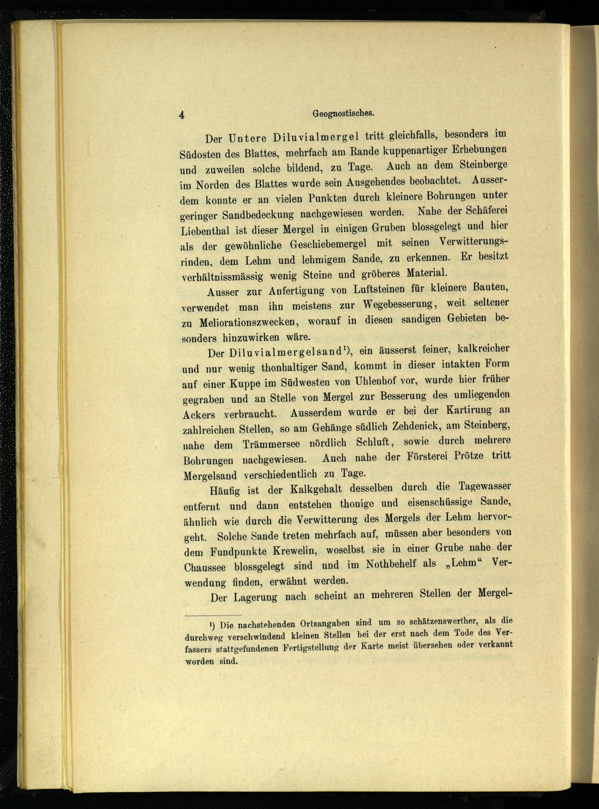 Der Diluvialmergelsand 1 ), ein äusserst feiner, kalkreicher und nur wenig thonhaltiger Sand, kommt in dieser intakten Form auf einer Kuppe im Südwesten von Uhlenhof vor, wurde hier früher gegraben und an Stelle von Mergel zur Besserung des umliegenden Ackers verbraucht. Ausserdem wurde er bei der Kartirung an zahlreichen Stellen, so am Gehänge südlich Zehdenick , am Steinberg, nahe dem Trämmersee nördlich Schluft, sowie durch mehrere Bohrungen nachgewiesen. Auch nahe der Försterei Prötze tritt Mergelsand verschiedentlich zu Tage.