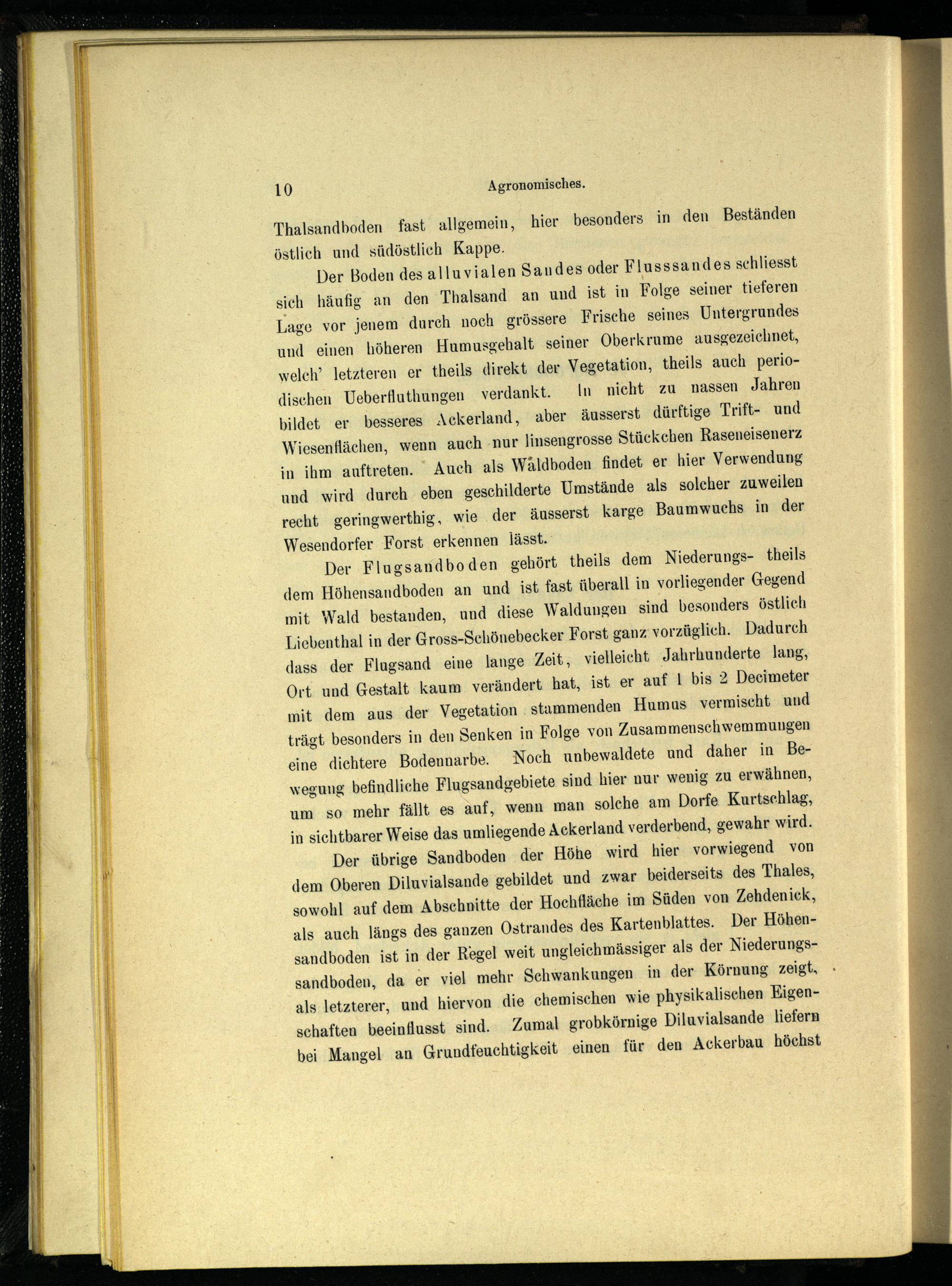 Der Flugsandboden gehört theils dem Niederungs - theils dem Höhensandboden an und ist fast überall in vorliegender Gegend mit Wald bestanden, und diese Waldungen sind besonders östlich Liebenthal in der Gross-Schönebecker Forst ganz vorzüglich. Dadurch dass der Flugsand eine lange Zeit, vielleicht Jahrhunderte lang, Ort und Gestalt kaum verändert hat, ist er auf 1 bis 2 Decimeter mit dem aus der Vegetation stammenden Humus vermischt und trägt besonders in den Senken in Folge von Zusammenschwemmungen eine dichtere Bodennarbe. Noch unbewaldete und daher in Bewegung befindliche Flugsandgebiete sind hier nur wenig zu erwähnen, um so mehr fällt es auf, wenn man solche am Dorfe Kurtschlag, in sichtbarer Weise das umliegende Ackerland verderbend, gewahr wird.