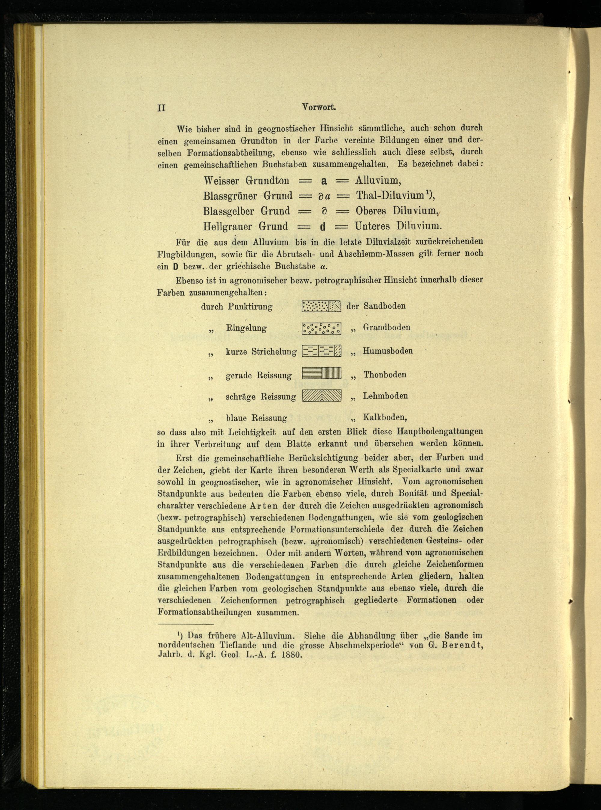 Erst die gemeinschaftliche Berücksichtigung beider aber, der Farben und der Zeichen, giebt der Karte ihren besonderen Werth als Specialkarte und zwar sowohl in geognostischer, wie in agronomischer Hinsicht. Vom agronomischen Standpunkte aus bedeuten die Farben ebenso viele, durch Bonität und Specialcharakterverschiedene Arten der durch die Zeichen ausgedrückten agronomisch (bezw. petrographisch) verschiedenen Bodengattungen, wie sie vom geologischen Standpunkte aus entsprechende Formationsunterschiede der durch die Zeichen ausgedrückten petrographisch (bezw. agronomisch) verschiedenen Gesteins- oder Erdbildungen bezeichnen. Oder mit andern Worten, während vom agronomischen Standpunkte aus die verschiedenen Farben die durch gleiche Zeichenformen zusammengehaltenen Bodengattungen in entsprechende Arten gliedern, halten die gleichen Farben vom geologischen Standpunkte aus ebenso viele, durch die verschiedenen Zeichenformen petrographisch gegliederte Formationen oder Formationsabtheilungen zusammen.