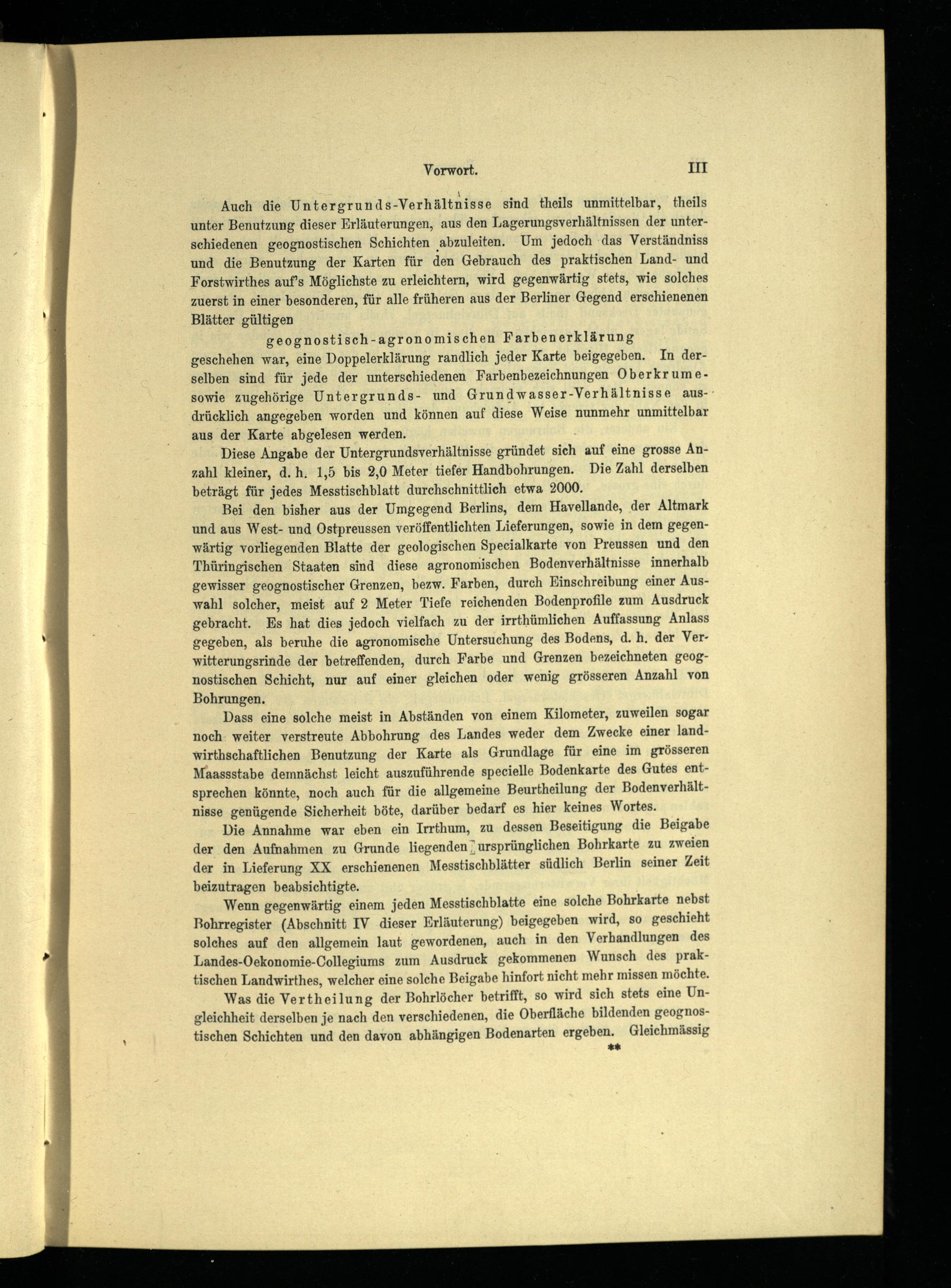Wenn gegenwärtig einem jeden Messtischblatte eine solche Bohrkarte nebst Bohrregister (Abschnitt IV dieser Erläuterung) beigegeben wird, so geschieht solches auf den allgemein laut gewordenen, auch in den Verhandlungen des Landes-Oekonomie-Collegiums zum Ausdruck gekommenen Wunsch des praktischen Landwirthes, welcher eine solche Beigabe hinfort nicht mehr missen möchte.