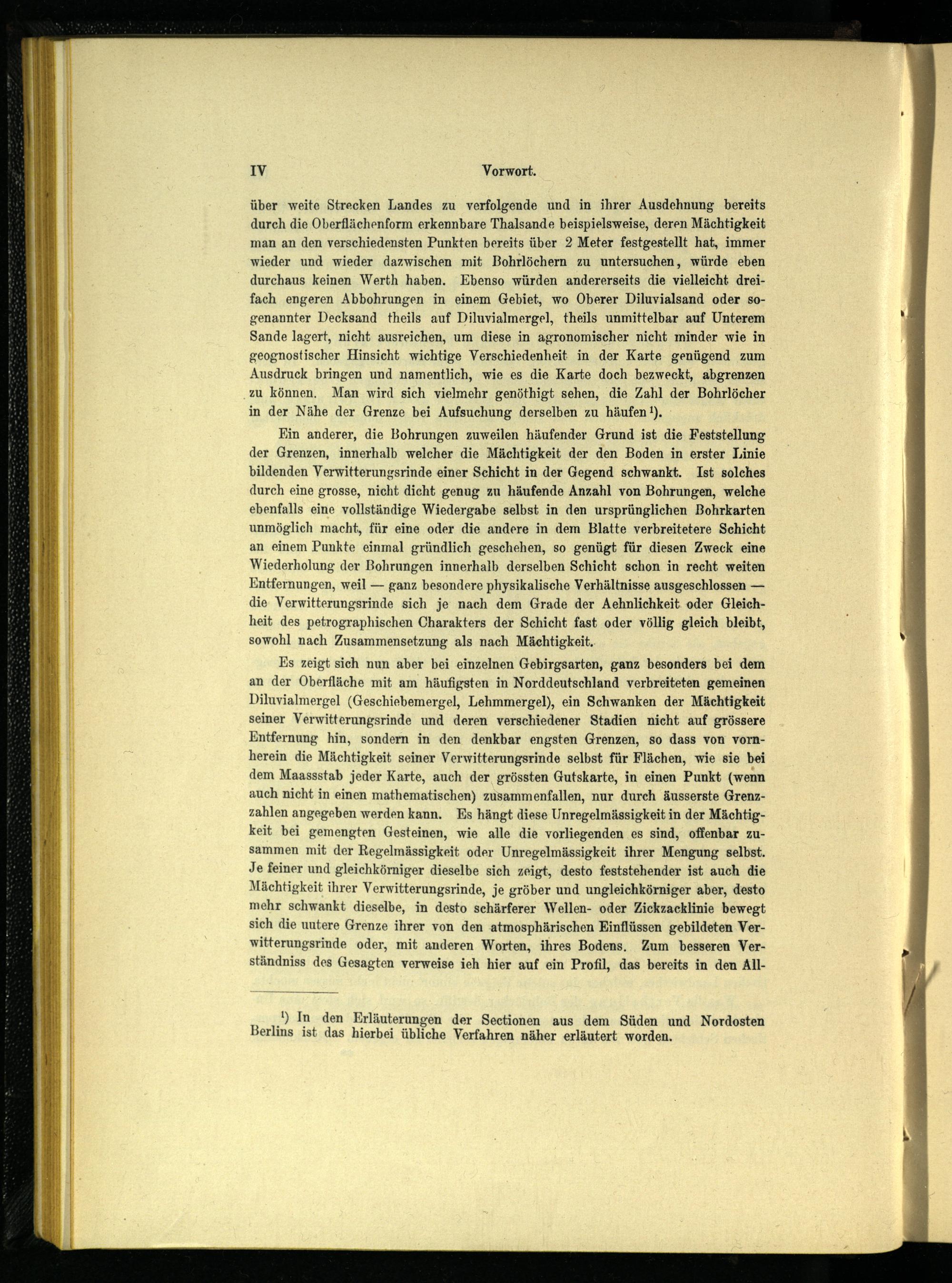 über weite Strecken Landes zu verfolgende und in ihrer Ausdehnung bereits durch die Oberflächenform erkennbare Thalsande beispielsweise, deren Mächtigkeit man an den verschiedensten Punkten bereits über 2 Meter festgestellt hat, immer wieder und wieder dazwischen mit Bohrlöchern zu untersuchen, würde eben durchaus keinen Werth haben. Ebenso würden andererseits die vielleicht dreifach engeren Abbohrungen in einem Gebiet, wo Oberer Diluvialsand oder sogenannter Decksand theils auf Diluvialmergel, theils unmittelbar auf Unterem Sande lagert, nicht ausreichen, um diese in agronomischer nicht minder wie in geognostischer Hinsicht wichtige Verschiedenheit in der Karte genügend zum Ausdruck bringen und namentlich, wie es die Karte doch bezweckt, abgrenzen zu können. Man wird sich vielmehr genöthigt sehen, die Zahl der Bohrlöcher in der Nähe der Grenze bei Aufsuchung derselben zu häufen 1 ).
