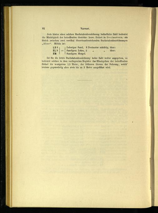 Ist für die letzte Buchstabenbezeichnung keine Zahl weiter angegeben, so bedeutet solches in dem vorliegenden Register das Hinabgehen der betreffenden Erdart bis wenigstens 1,5 Meter, der früheren Grenze der Bohrung, welch’ letztere gegenwärtig aber stets bis zu 2 Meter ausgeführt wird.