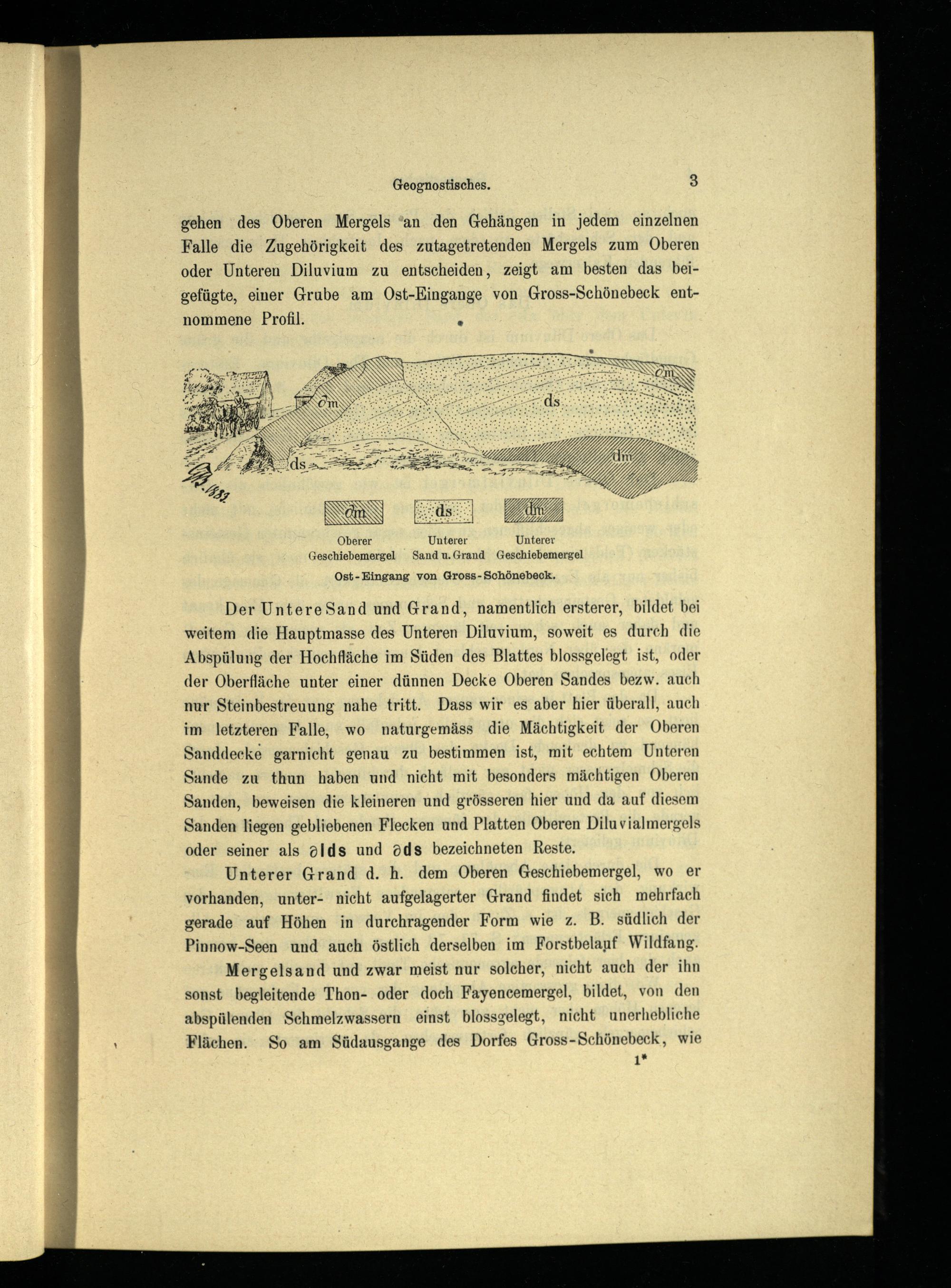 Mergelsand und zwar meist nur solcher, nicht auch der ihn sonst begleitende Thon- oder doch Fayencemergel, bildet, von den abspülenden Schmelzwassern einst blossgelegt, nicht unerhebliche Flächen. So am Südausgange des Dorfes Gross-Schönebeck , wie