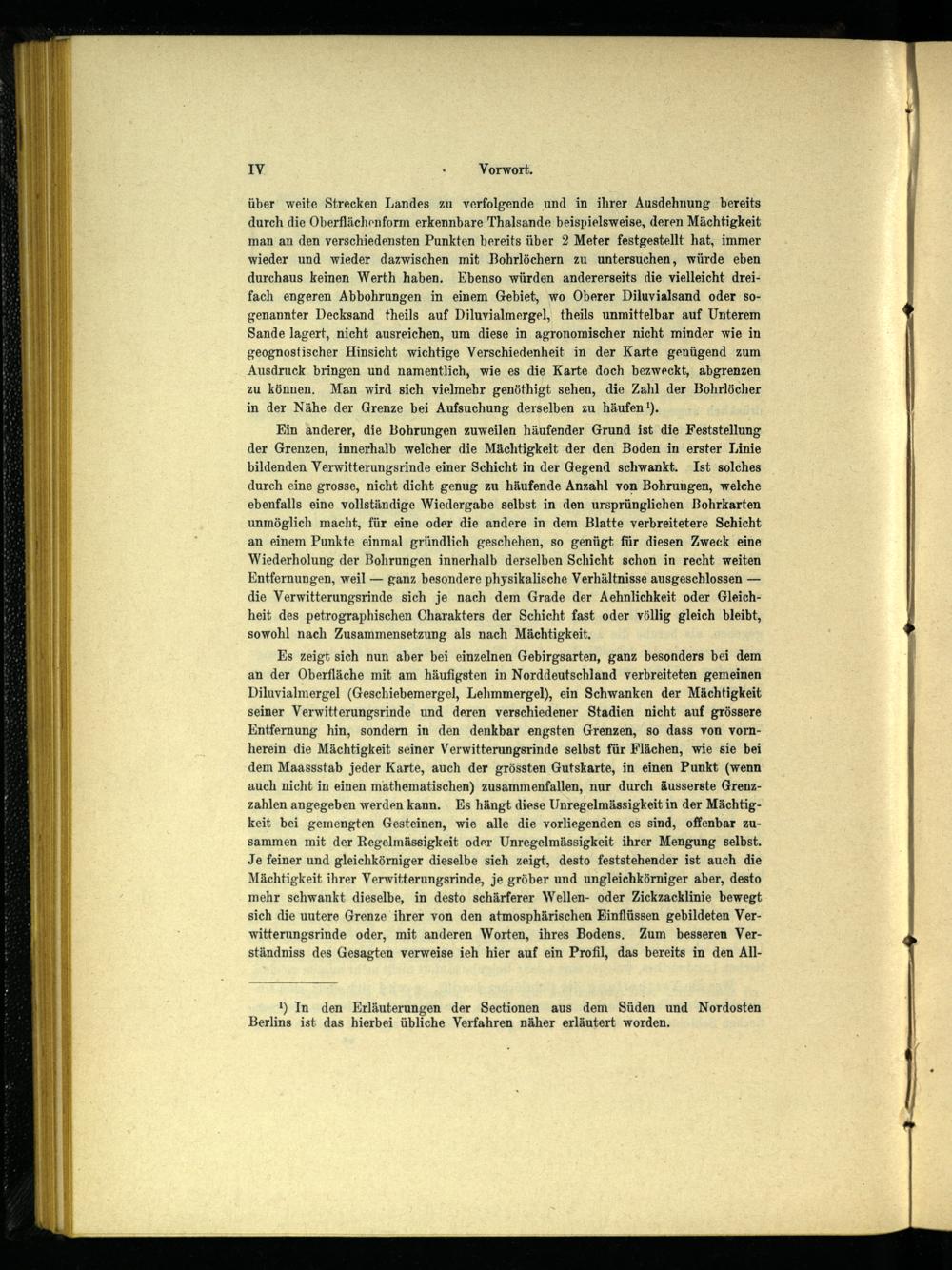 Ein anderer, die Bohrungen zuweilen häufender Grund ist die Feststellung der Grenzen, innerhalb welcher die Mächtigkeit der den Boden in erster Linie bildenden Verwitterungsrinde einer Schicht in der Gegend schwankt. Ist solches durch eine grosse, nicht dicht genug zu häufende Anzahl von Bohrungen, welche ebenfalls eine vollständige Wiedergabe selbst in den ursprünglichen Bohrkarten unmöglich macht, für eine oder die andere in dem Blatte verbreitetere Schicht an einem Punkte einmal gründlich geschehen, so genügt für diesen Zweck eine Wiederholung der Bohrungen innerhalb derselben Schicht schon in recht weiten Entfernungen, weil — ganz besondere physikalische Verhältnisse ausgeschlossen — die Verwitterungsrinde sich je nach dem Grade der Aehnlichkeit oder Gleichheit des petrographischen Charakters der Schicht fast oder völlig gleich bleibt, sowohl nach Zusammensetzung als nach Mächtigkeit.