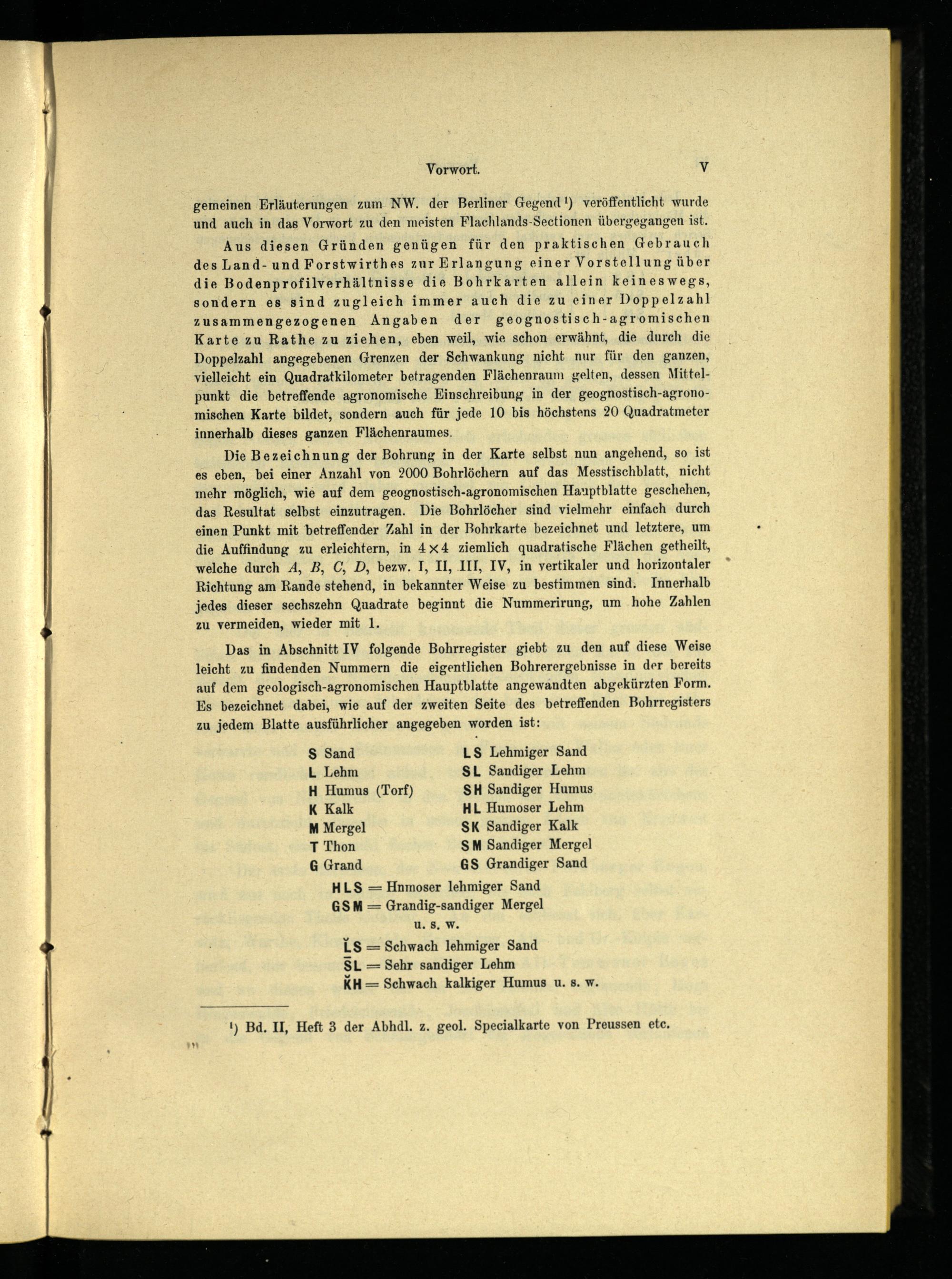 Das in Abschnitt IV folgende Bohrregister giebt zu den auf diese Weise leicht zu findenden Nummern die eigentlichen Bohrerergebnisse in der bereits auf dem geologisch-agronomischen Hauptblatte angewandten abgekürzten Form. Es bezeichnet dabei, wie auf der zweiten Seite des betreffenden Bohrregisters zu jedem Blatte ausführlicher angegeben worden ist: