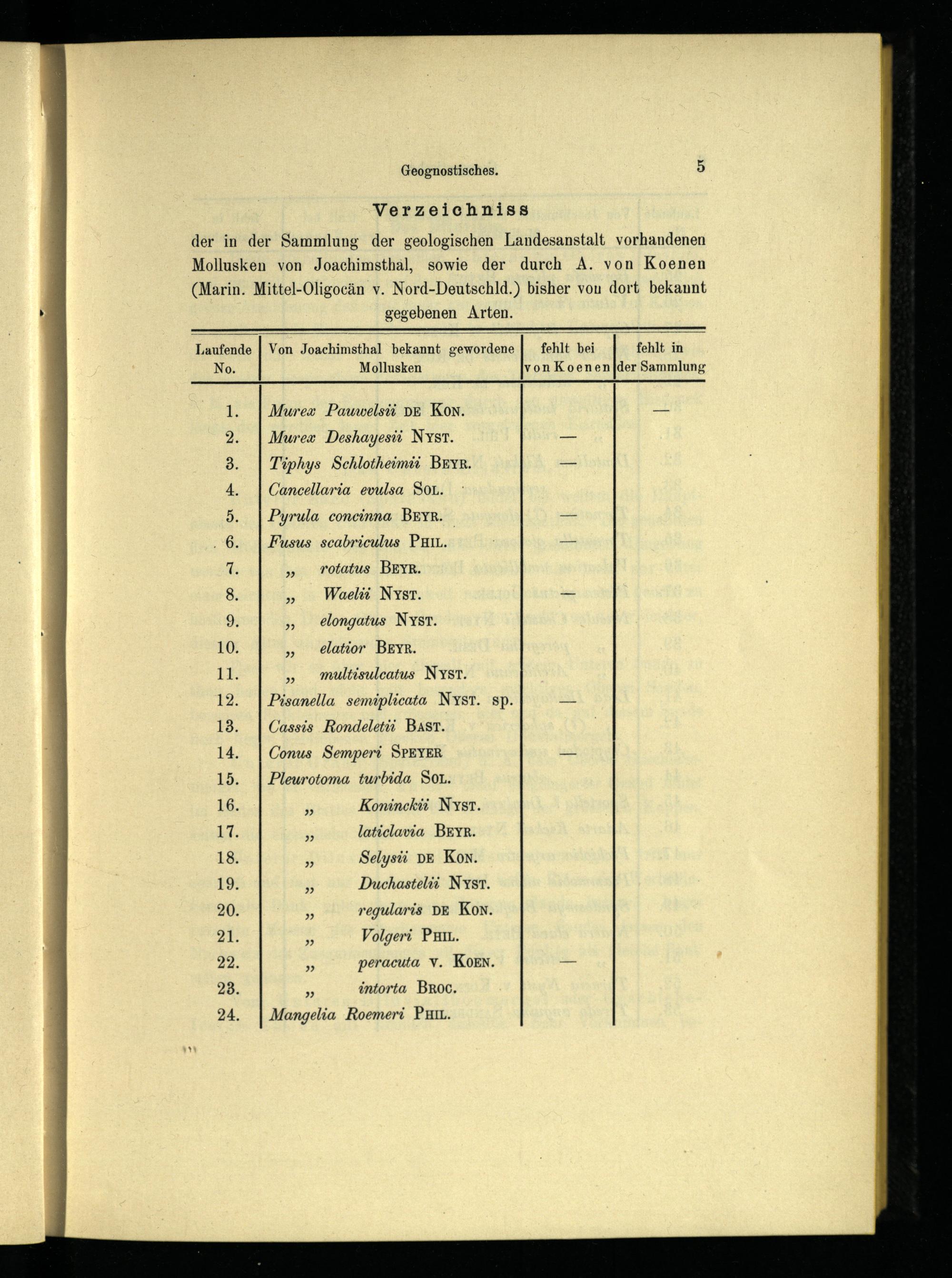 der in der Sammlung der geologischen Landesanstalt vorhandenen Mollusken von Joachimsthal , sowie der durch A. von Koenen (Marin. Mittel-Oligocän v. Nord-Deutschld.) bisher von dort bekannt