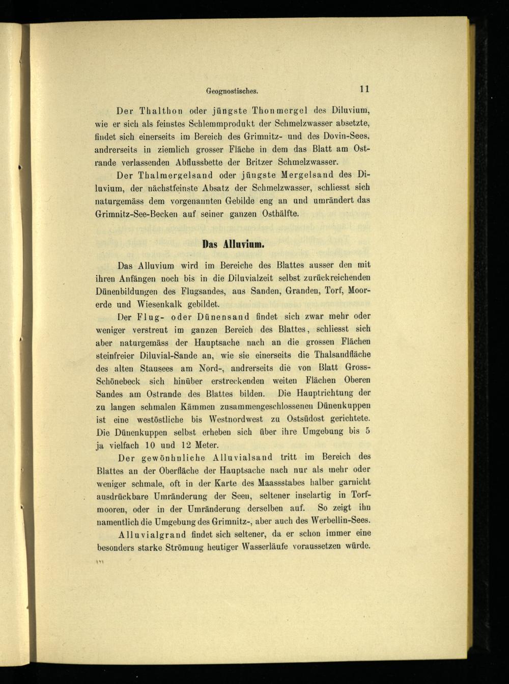 Der Thalthon oder jüngste Thonmergel des Diluvium, wie er sich als feinstes Sohlemmprodukt der Schmelzwasser absetzte, findet sich einerseits im Bereich des Grimnitz- und des Dovin-Sees, andrerseits in ziemlich grosser Fläche in dem das Blatt am Ostrande verlassenden Abflussbette der Britzer Schmelzwasser.