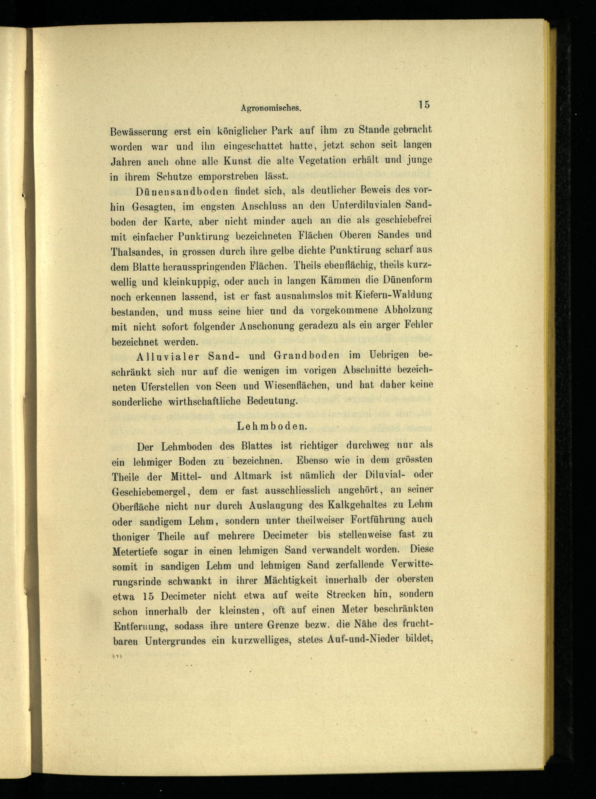Der Lehmboden des Blattes ist richtiger durchweg nur als ein lehmiger Boden zu bezeichnen. Ebenso wie in dem grössten Theile der Mittel- und Altmark ist nämlich der Diluvial- oder Geschiebemergel, dem er fast ausschliesslich angehört, an seiner Oberfläche nicht nur durch Auslaugung des Kalkgehaltes zu Lehm oder sandigem Lehm, sondern unter theilweiser Fortführung auch thoniger Theile auf mehrere Decimeter bis stellenweise fast zu Metertiefe sogar in einen lehmigen Sand verwandelt worden. Diese somit in sandigen Lehm und lehmigen Sand zerfallende Verwitterungsrinde schwankt in ihrer Mächtigkeit innerhalb der obersten etwa 15 Decimeter nicht etwa auf weite Strecken hin, sondern schon innerhalb der kleinsten, oft auf einen Meter beschränkten Entfernung, sodass ihre untere Grenze bezvv. die Nähe des fruchtbaren Untergrundes ein kurzwelliges, stetes Auf-und-Nieder bildet,