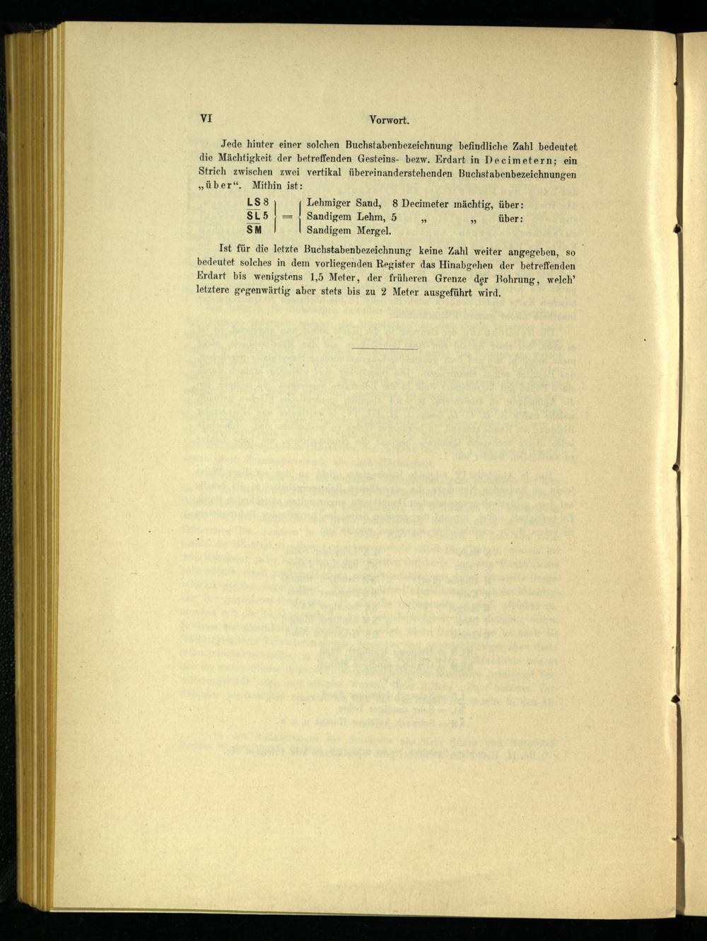 Ist für die letzte Buchstabenbezeichnung keine Zahl weiter angegeben, so bedeutet solches in dem vorliegenden Register das Hinabgehen der betreffenden Erdart bis wenigstens 1,5 Meter, der früheren Grenze der Bohrung, welch’ letztere gegenwärtig aber stets bis zu 2 Meter ausgeführt wird.