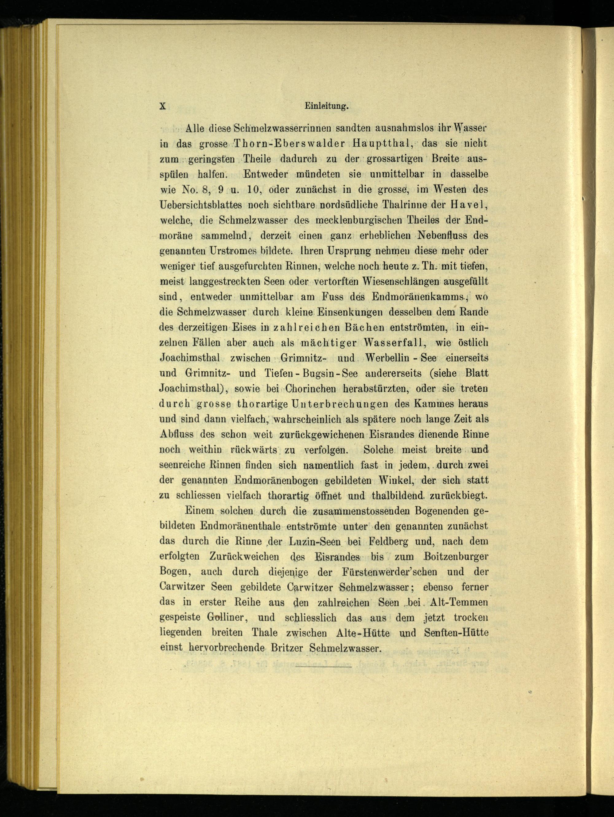 Einem solchen durch die zusammenstossenden Bogenenden gebildeten Endmoränenthale entströmte unter den genannten zunächst das durch die Rinne der Luzin-Seen bei Feldberg und, nach dem erfolgten Zurückweichen des Eisrandes bis zum Boitzenburger Bogen, auch durch diejenige der Fürstenwerder’schen und der Carwitzer Seen gebildete Carwitzer Schmelzwasser; ebenso ferner das in erster Reihe aus den zahlreichen Seen bei Alt-Temmen gespeiste Golliner, und schliesslich das aus dem jetzt trocken liegenden breiten Thale zwischen Alte-Hütte und Senften-Hütte einst hervorbrechende Britzer Schmelzwasser.