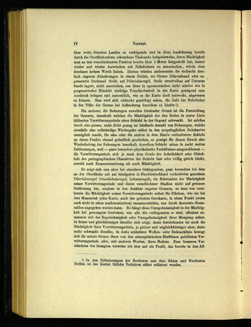 Ein anderer, die Bohrungen zuweilen häufender Grund ist die Feststellung der Grenzen, innerhalb welcher die Mächtigkeit der den Boden in erster Linie bildenden Verwitterungsrinde einer Schicht in der Gegend schwankt. Ist solches durch eine grosse, nicht dicht genug zu häufende Anzahl von Bohrungen, welche ebenfalls eine vollständige Wiedergabe selbst in den ursprünglichen Bohrkarten unmöglich macht, für eine oder die andere in dem Blatte verbreitetere Schicht an einem Punkte einmal gründlich geschehen, so genügt für diesen Zweck eine Wiederholung der Bohrungen innerhalb derselben Schicht schon in recht weiten Entfernungen, weil — ganz besondere physikalische Verhältnisse ausgeschlossen — die Verwitterungsrinde sich je nach dem Grade der Aehnlichkeit oder Gleichheit des petrographischen Charakters der Schicht fast oder völlig gleich bleibt, sowohl nach Zusammensetzung als nach Mächtigkeit.