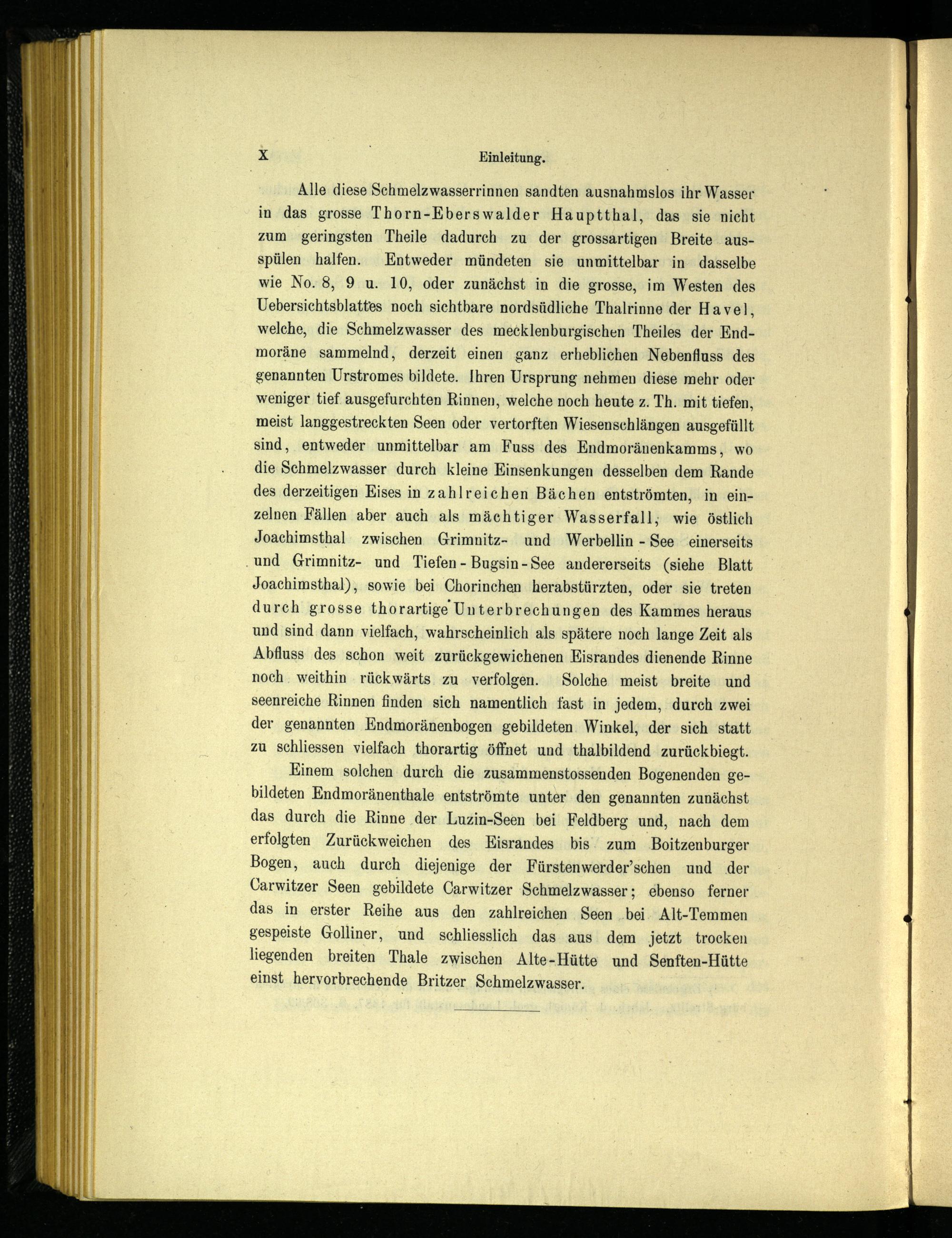 Einem solchen durch die zusammenstossenden Bogenenden gebildeten Endmoränenthale entströmte unter den genannten zunächst das durch die Rinne der Luzin-Seen bei Feldberg und, nach dem erfolgten Zurückweichen des Eisrandes bis zum Boitzenburger Bogen, auch durch diejenige der Fürstenwerder ’sehen und der Carwitzer Seen gebildete Carwitzer Schmelzwasser; ebenso ferner das in erster Reihe aus den zahlreichen Seen bei Alt-Temmen gespeiste Golliner, und schliesslich das aus dem jetzt trocken liegenden breiten Thale zwischen Alte-Hütte und Senften-Hütte einst hervorbrechende Britzer Sehmelzwasser.