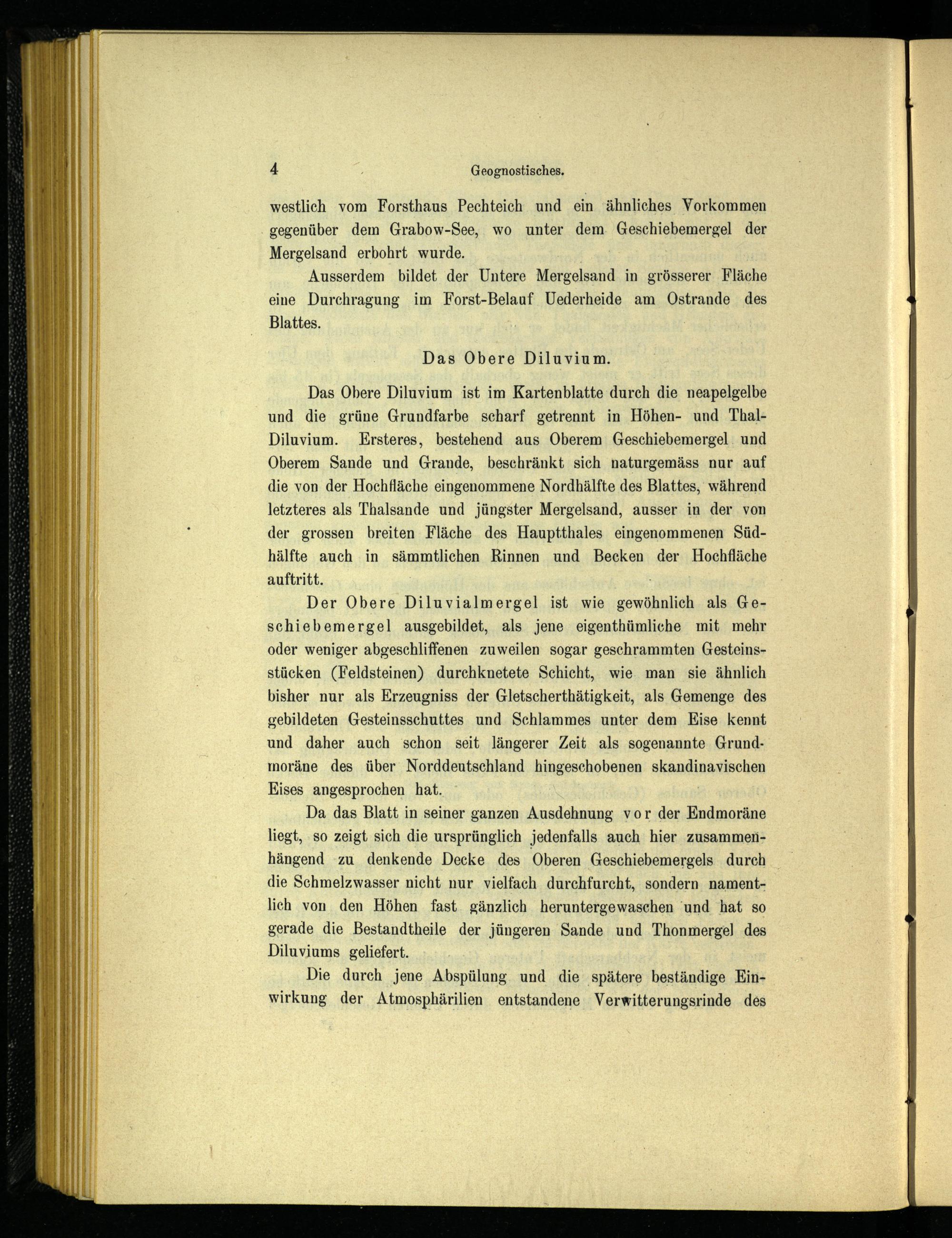 Das Obere Diluvium ist im Kartenblatte durch die neapelgelbe und die grüne Grundfarbe scharf getrennt in Höhen- und Tbal- Diluvium. Ersteres, bestehend aus Oberem Geschiebemergel und Oberem Sande und Grande, beschränkt sich naturgemäss nur auf die von der Hochfläche eingenommene Nordhälfte des Blattes, während letzteres als Thalsande und jüngster Mergelsand, ausser in der von der grossen breiten Fläche des Hauptthaies eingenommenen Südhälfte auch in sämmtlichen Rinnen und Becken der Hochfläche auftritt.