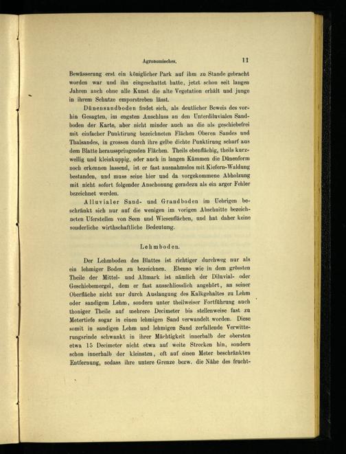 Dünensandboden findet sich, als deutlicher Beweis des vorhin Gesagten, im engsten Anschluss an den Unterdiluvialen Sandboden der Karte, aber nicht minder auch an die als geschiebefrei mit einfacher Punktirung bezeichneten Flächen Oberen Sandes und Thalsandes, in grossen durch ihre gelbe dichte Punktirung scharf aus dem Blatte herausspringenden Flächen. Theils ebenflächig, theils kurzwellig und kleinkuppig, oder auch in langen Kämmen die Dünenform noch erkennen lassend, ist er fast ausnahmslos mit Kiefern-Waldung bestanden, und muss seine hier und da vorgekommene Abholzung mit nicht sofort folgender Anschonung geradezu als ein arger Fehler bezeichnet werden.