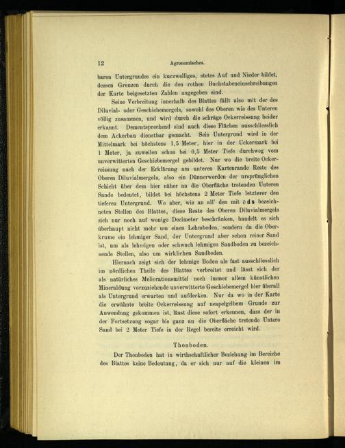 Hiernach zeigt sich der lehmige Boden als fast ausschliesslich im nördlichen Theile des Blattes verbreitet und lässt sich der als natürliches Meliorationsmittel noch immer allem künstlichen Mineraldung vorzuziehende unverwitterte Geschiebemergel hier überall als Untergrund erwarten und aufdecken. Nur da wo in der Karte die erwähnte breite Ockerreissung auf neapelgelbem Grunde zur Anwendung gekommen ist, lässt diese sofort erkennen, dass der in der Fortsetzung sogar bis ganz an die Oberfläche tretende Untere Sand bei 2 Meter Tiefe in der Regel bereits erreicht wird.