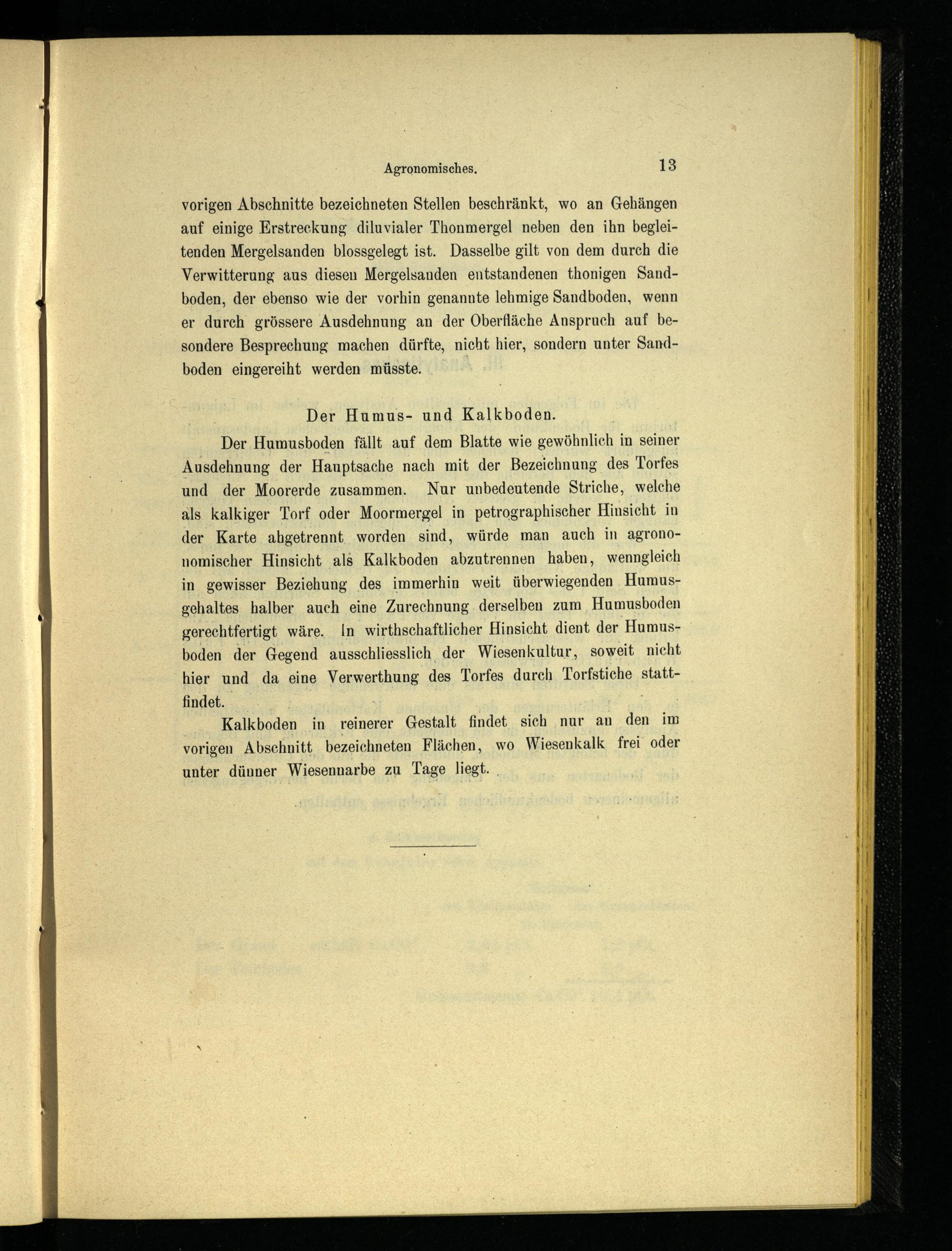 Der Humusboden fällt auf dem Blatte wie gewöhnlich in seiner Ausdehnung der Hauptsache nach mit der Bezeichnung des Torfes und der Moorerde zusammen. Nur unbedeutende Striche, welche als kalkiger Torf oder Moormergel in petrographischer Hinsicht in der Karte ahgetrennt worden sind, würde man auch in agrono- nomischer Hinsicht als Kalkboden abzutrennen haben, wenngleich in gewisser Beziehung des immerhin weit überwiegenden Humusgehaltes halber auch eine Zurechnung derselben zum Humusboden gerechtfertigt wäre, ln wirtschaftlicher Hinsicht dient der Humusboden der Gegend ausschliesslich der Wiesenkultur, soweit nicht hier und da eine Verwertung des Torfes durch Torfstiche stattfindet.