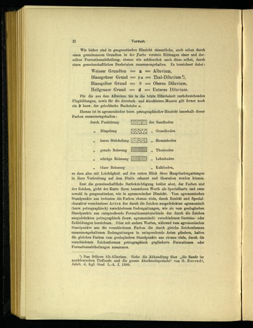 Erst die gemeinschaftliche Berücksichtigung beider aber, der Farben und der Zeichen, giebt der Karte ihren besonderen Werth als Specialkarte und zwar sowohl in geognostischer, wie in agronomischer Hinsicht. Vom agronomischen Standpunkte aus bedeuten die Farben ebenso viele, durch Bonität und Specialcharakter verschiedene Arten der durch die Zeichen ausgedrückten agronomisch (bezw. petrographisch) verschiedenen Bodengattungen, wie sie vom geologischen Standpunkte aus entsprechende Formationsunterschiede der durch die Zeichen ausgedrückten petrographisch (bezw. agronomisch) verschiedenen Gesteins- oder Erdbildungen bezeichnen. Oder mit andern Worten, während vom agronomischen Standpunkte aus die verschiedenen Farben die durch gleiche Zeichenformen zusammengehaltenen Bodengattungen in entsprechende Arten gliedern, halten die gleichen Farben vom geologischen Standpunkte aus ebenso viele, durch die verschiedenen Zeichenformen petrographisch gegliederte Formationen oder Formationsabtheilungen zusammen.