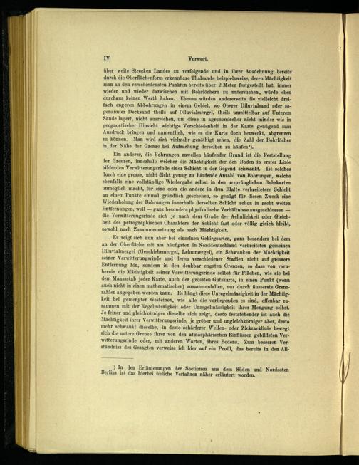 Ein anderer, die Bohrungen zuweilen häufender Grund ist die Feststellung der Grenzen, innerhalb welcher die Mächtigkeit der den Boden in erster Linie bildenden Verwitterungsrinde einer Schicht in der Gegend schwankt. Ist solches durch eine grosse, nicht dicht genug zu häufende Anzahl von Bohrungen, welche ebenfalls eine vollständige Wiedergabe selbst in den ursprünglichen ßohrkarten unmöglich macht, für eine oder die andere in dem Blatte verbreitetere Schicht an einem Punkte einmal gründlich geschehen, so genügt für diesen Zweck eine Wiederholung der Bohrungen innerhalb derselben Schicht schon in recht weiten Entfernungen, weil — ganz besondere physikalische Verhältnisse ausgeschlossen — die Verwitterungsrinde sich je nach dem Grade der Aehnlichkeit oder Gleichheit des petrographischen Charakters der Schicht fast oder völlig gleich bleibt, sowohl nach Zusammensetzung als nach Mächtigkeit.