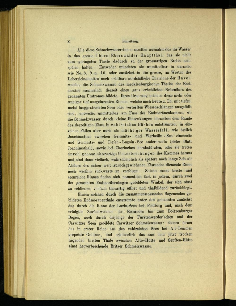Einem solchen durch die zusammenstossenden Bogenenden gebildeten Endmoränenthale entströmte unter den genannten zunächst das durch die Rinne der Luzin-Seen bei Feldberg und, nach dem erfolgten Zurückweichen des Eisrandes bis zum Boitzenburger Bogen, auch durch diejenige der Fürstenwerder’schen und der Carwitzer Seen gebildete Carwitzer Schmelzwasser; ebenso ferner das in erster Reihe aus den zahlreichen Seen bei Alt-Temmen gespeiste Golliner, und schliesslich das aus dem jetzt trocken liegenden breiten Thale zwischen Alte-Hütte und Senften-Hütte einst hervorbrechende Britzer Schmelzwasser.